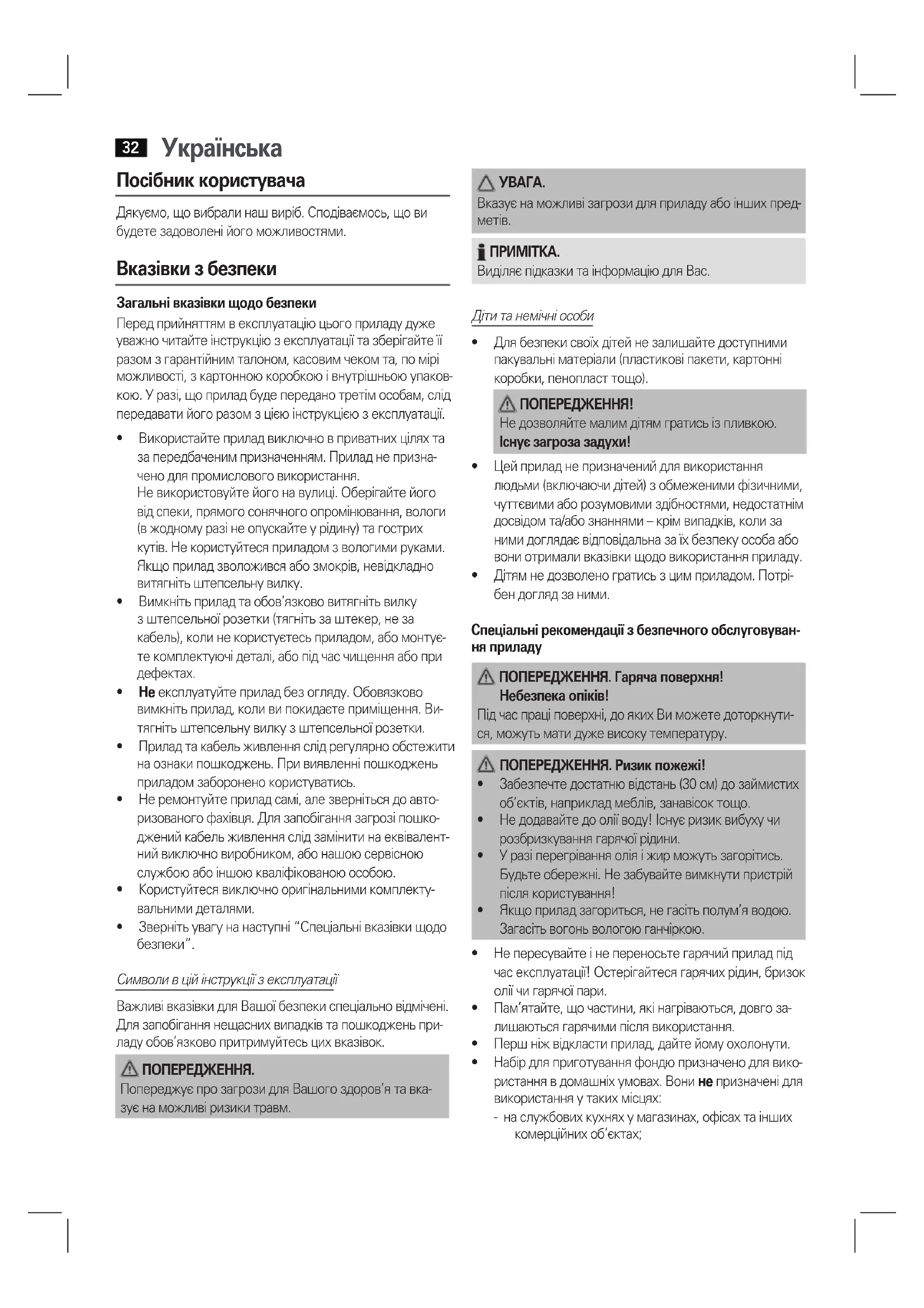 Символи в цій інструкції з експлуатації ВажливівказівкидляВашоїбезпекиспеціальновідмічені. Для запобігання нещасних випадків та пошкоджень при- ладуобов’язковопритримуйтесьцихвказівок. ПОПЕРЕДЖЕННЯ. ПопереджуєпрозагрозидляВашогоздоров’ятавка- зує на можливі ризики травм.