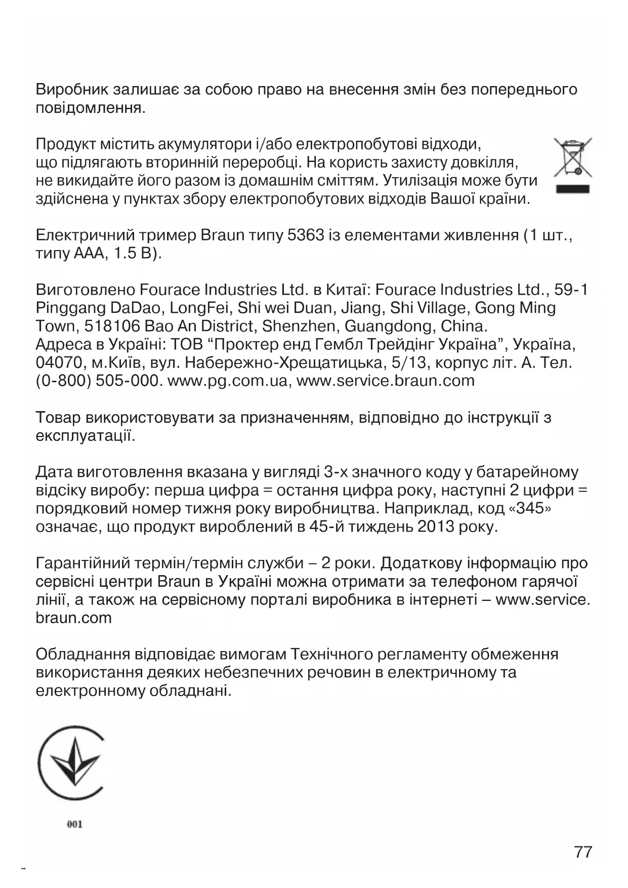 - ‰Ó‚„ËÈ ÚËÏ¥Ì„Û˛˜ËÈ „·¥Ìˆ¸ (7): 8 ÏÏ è¯ Ì¥Ê ÔËπ‰ÌÛ‚‡ÚË ÚËÏ¥Ì„Û˛˜ËÈ „·¥Ìˆ¸, ÔÂÂÍÓ̇ÈÚÂÒfl, ˘Ó ÔËÒÚ¥È ‚ËÏÍÌÂÌÓ. ꇉËÏÓ ÔÓ˜Ë̇ÚË ÚËϥ̄ۂ‡ÌÌfl ‰Ó‚„ËÏ „·¥ÌˆÂÏ. é‰fl„Ì¥Ú¸ ÈÓ„Ó Ì‡ ¥ÊÛ˜Û „ÓÎ¥‚ÍÛ (2), ‰ÓÍË ‚Ó̇ Ì Í·ˆÌÂ, ÒÚ‡‚¯Ë ̇ Ï¥ÒˆÂ. ì‚¥ÏÍÌ¥Ú¸ ÔËÒÚ¥È Ú‡ Ó·ÂÂÊÌÓ ‚‰¥Ú¸ „·¥ÌˆÂÏ ÔÓ ·Ó‚‡ı ÔÓÚË Ì‡ÔflÏÍÛ ÓÒÚÛ ‚ÓÎÓÒÒfl, flÍ ÔÓ͇Á‡ÌÓ Ì‡ Ï‡Î˛ÌÍÛ (b). èË ˆ¸ÓÏÛ Ó‰Ì‡ ¥Á ÒÚÓ¥Ì „·¥Ìˆfl ÔÓ‚ËÌ̇ ÍÓ‚Á‡ÚË ÔÓ ¯Í¥¥. óˢÂÌÌfl Ú‡ ‰Ó„Îfl‰ è¯ Ì¥Ê ÔÓ˜‡ÚË ˜Ë˘ÂÌÌfl, Á‡‚Ê‰Ë ‚ËÏË͇ÈÚ ÔË·‰. ḁ́ϥڸ ¥ÊÛ˜Û „ÓÎ¥‚ÍÛ (2), ÔÓ‚ÂÌÛ‚¯Ë ªª ̇ 90° ÔÓÚË „Ó‰ËÌÌËÍÓ‚Óª ÒÚ¥ÎÍË, ‡ ÔÓÚ¥Ï ÔÓÚfl„Ì¥Ú¸ ‚„ÓÛ. áÌflÚÛ ¥ÊÛ˜Û „ÓÎ¥‚ÍÛ ÏÓÊ̇ ÔÓÏËÚË Ô¥‰ ÚÂÔÎÓ˛ ÔÓÚÓ˜ÌÓ˛ ‚Ó‰Ó˛ (c). èÂÂÍÓ̇ÈÚÂÒfl, ˘Ó ¥ÊÛ˜‡ „ÓÎ¥‚͇ ÔÓ‚Ì¥ÒÚ˛ ‚ËÒÓı·, Ô¯ Ì¥Ê ÒÚ‡‚ËÚË ªª ̇ Ï¥ÒˆÂ. Для зберігання може бути використана підставка (5). Приєднайте захисний ковпачок (1) до ріжучої головки (2). ꇉËÏÓ Áχ˘Û‚‡ÚË ÎÂÁÓ Í‡Ôβ ΄ÍÓ„Ó Ï‡¯ËÌÌÓ„Ó Ï‡Ò· ‰‚¥˜¥ ̇ ¥Í ‡·Ó ˜‡ÒÚ¥¯Â, flÍ˘Ó ÇË ÏËπÚ ¥ÊÛ˜Û „ÓÎ¥‚ÍÛ ‚Ó‰Ó˛. 91221272_PT_5010_EURO_S4-86.indd 7691221272_PT_5010_EURO_S4-86.indd 76 02.11.16 11:4602.11.16 11:46 CSS APPROVED Effective Date 4Nov2016 GMT - Printed 04Jan2017 Page 76 of 8677 ÇËÓ·ÌËÍ Á‡Î˯‡π Á‡ ÒÓ·Ó˛ Ô‡‚Ó Ì‡ ‚ÌÂÒÂÌÌfl ÁÏ¥Ì ·ÂÁ ÔÓÔÂÂ‰Ì¸Ó„Ó ÔÓ‚¥‰ÓÏÎÂÌÌfl. Продукт містить акумулятори і/або електропобутові відходи, що підлягають вторинній переробці. На користь захисту довкілля, не викидайте його разом із домашнім сміттям. Утилізація може бути здійснена у пунктах збору електропобутових відходів Вашої країни. Електричний тример Braun типу 5363 із елементами живлення (1 шт., типу AAA, 1.5 В). Виготовлено Fourace Industries Ltd. в Китаї: Fourace Industries Ltd., 59-1 Pinggang DaDao, LongFei, Shi wei Duan, Jiang, Shi Village, Gong Ming Town, 518106 Bao An District, Shenzhen, Guangdong, China. Адреса в Україні: ТОВ “Проктер енд Гембл Трейдінг Україна”, Україна, 04070, м.Київ, вул. Набережно-Хрещатицька, 5/13, корпус літ. А. Тел. (0-800) 505-000. www.pg.com.ua, www.service.braun.com íÓ‚‡ ‚ËÍÓËÒÚÓ‚Û‚‡ÚË Á‡ ÔËÁ̇˜ÂÌÌflÏ, ‚¥‰ÔÓ‚¥‰ÌÓ ‰Ó ¥ÌÒÚÛ͈¥ª Á ÂÍÒÔÎÛ‡Ú‡ˆ¥ª. Дата виготовлення вказана у вигляді 3-х значного коду у батарейному відсіку виробу: перша цифра = остання цифра року, наступні 2 цифри = порядковий номер тижня року виробництва. Наприклад, код «345» означає, що продукт вироблений в 45-й тиждень 2013 року. Гарантійний термін/термін служби – 2 роки. ÑÓ‰‡ÚÍÓ‚Û ¥ÌÙÓχˆ¥˛ ÔÓ Ò‚¥ÒÌ¥ ˆÂÌÚË Braun ‚ ì͇ªÌ¥ ÏÓÊ̇ ÓÚËχÚË Á‡ ÚÂÎÂÙÓÌÓÏ „‡fl˜Óª Υ̥ª, ‡ Ú‡ÍÓÊ Ì‡ Ò‚¥ÒÌÓÏÛ ÔÓڇΥ ‚ËÓ·ÌË͇ ‚ ¥ÌÚÂÌÂÚ¥ – www.service. braun.com Обладнання відповідає вимогам Технічного регламенту обмеження використання деяких небезпечних речовин в електричному та електронному обладнані. 91221272_PT_5010_EURO_S4-86.indd 7791221272_PT_5010_EURO_S4-86.indd 77 02.11.16 11:4602.11.16 11:46 CSS APPROVED Effective Date 4Nov2016 GMT - Printed 04Jan2017 Page 77 of 8678 Гарантійні зобов’язання виробника Для всіх виробів ми даємо гарантію на два роки, починаючи з моменту придбання виробу або з дати його виробництва, у разі відсутності або неналежного оформлення гарантійного талону на виріб. Протягом гарантійного періоду ми безкоштовно усуваємо шляхом ремонту, заміни деталей або заміни всього виробу будь-які заводські дефекти, викликані недостатньою якістю матеріалів або складання. У випадку неможливості ремонту в гарантійний період виріб може бути замінений на новий або аналогічний відповідно до Закону України «Про захист прав споживачів». Гарантія набуває сили лише, якщо дата купівлі підтверджується печаткою та підписом дилера (магазину) на гарантійному талоні або на останній сторінці оригінальної інструкції з експлуатації Braun, яка також може бути гарантійним т