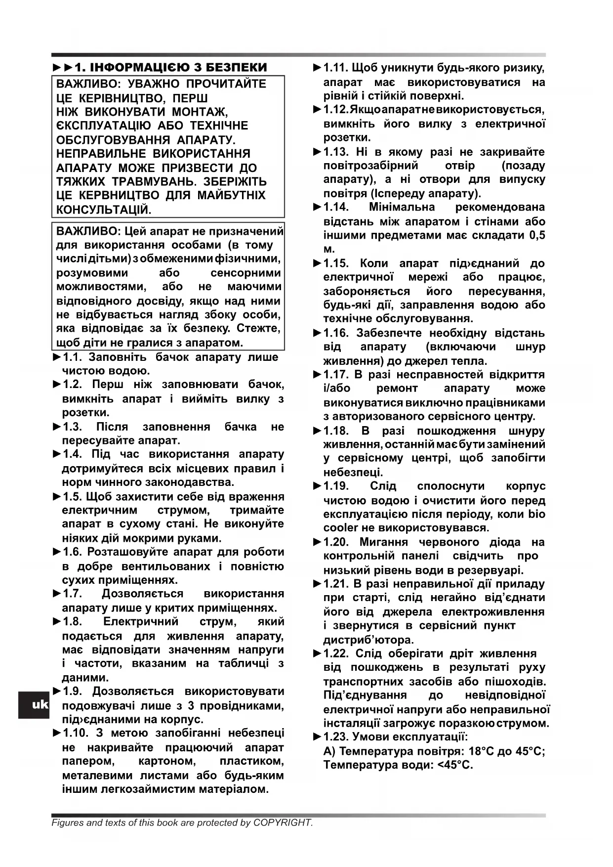сервизuk ►►1. ІНФОРМАЦІЄЮ З БЕЗПЕКИ ВАЖЛИВО: УВАЖНО ПРОЧИТАЙТЕ ЦЕ КЕРІВНИЦТВО, ПЕРШ НІЖ ВИКОНУВАТИ МОНТАЖ, ЄКСПЛУАТАЦІЮ АБО ТЕХНІЧНЕ ОБСЛУГОВУВАННЯ АПАРАТУ. НЕПРАВИЛЬНЕ ВИКОРИСТАННЯ АПАРАТУ МОЖЕ ПРИЗВЕСТИ ДО ТЯЖКИХ ТРАВМУВАНЬ. ЗБЕРІЖІТЬ ЦЕ КЕРВНИЦТВО ДЛЯ МАЙБУТНІХ КОНСУЛЬТАЦІЙ. ВАЖЛИВО: Цей апарат не призначений для використання особами (в тому числі дітьми) з обмеженими фізичними, розумовими або сенсорними можливостями, або не маючими відповідного досвіду, якщо над ними не відбувається нагляд збоку особи, яка відповідає за їх безпеку. Стежте, щоб діти не гралися з апаратом. ►1.1. Заповніть бачок апарату лише чистою водою. ►1.2. Перш ніж заповнювати бачок, вимкніть апарат і вийміть вилку з