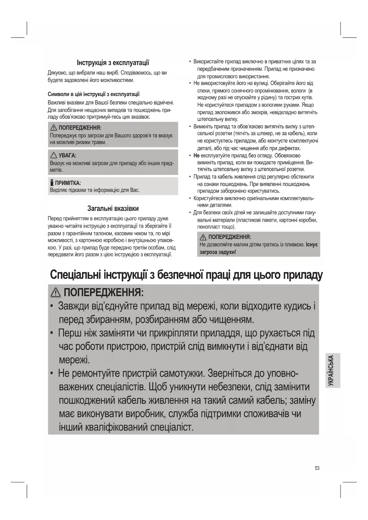 Виділяє підказки та інформацію для Вас. Загальні вказівки Перед прийняттям в експлуатацію цього приладу дуже уважно читайте інструкцію з експлуатації та зберігайте її разом з гарантійним талоном, касовим чеком та, по мірі можливості, з картонною коробкою і внутрішньою упаков- кою. У разі, що прилад буде передано третім особам, слід передавати його разом з цією інструкцією з експлуатації. Спеціальні інструкції з безпечної праці для цього приладу ПОПЕРЕДЖЕННЯ: