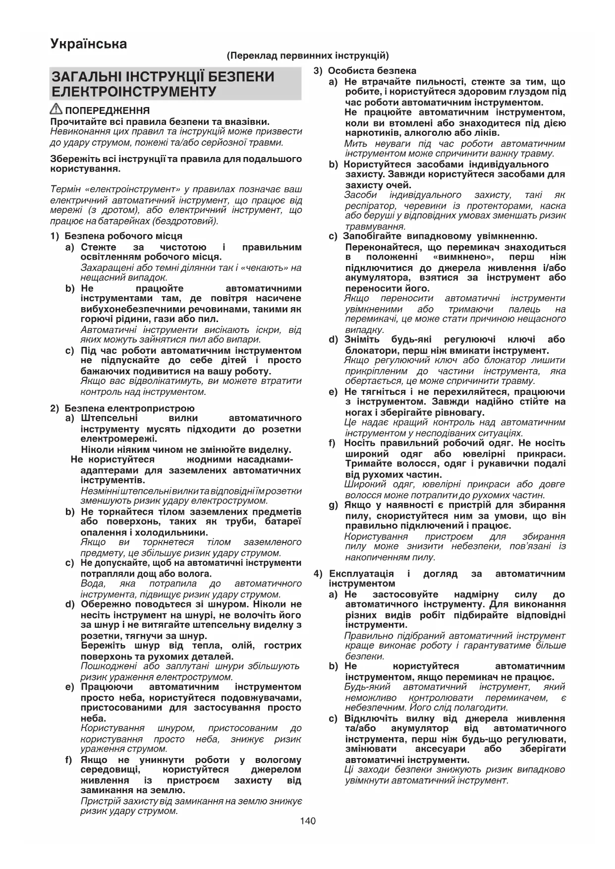 b) Не користуйтеся автоматичним інструментом, якщо перемикач не працює. Будь-який автоматичний інструмент, який неможливо контролювати перемикачем, є небезпечним. Його слід полагодити. c) Відключіть вилку від джерела живлення та/або акумулятор від автоматичного інструмента , перш ніж будь-що регулювати, змінювати аксесуари або зберігати автоматичні інструменти. Ці заходи безпеки знижують ризик випадково увімкнути автоматичний інструмент. ЗАГАЛЬНІ ІНСТРУКЦІЇ БЕЗПЕКИ ЕЛЕКТРОІНСТРУМЕНТУ ПОПЕРЕДЖЕННЯ Прочитайте всі правила безпеки та вказівки. Невиконання цих правил та інструкцій може призвести до удару струмом, пожежі та/або серйозної травми. Збережіть всі інструкції та правила для подальшого користування. Термін «електроінструмент» у правилах позначає ваш електричний автоматичний інструмент, що працює від мережі (з дротом), або електричний інструмент, що