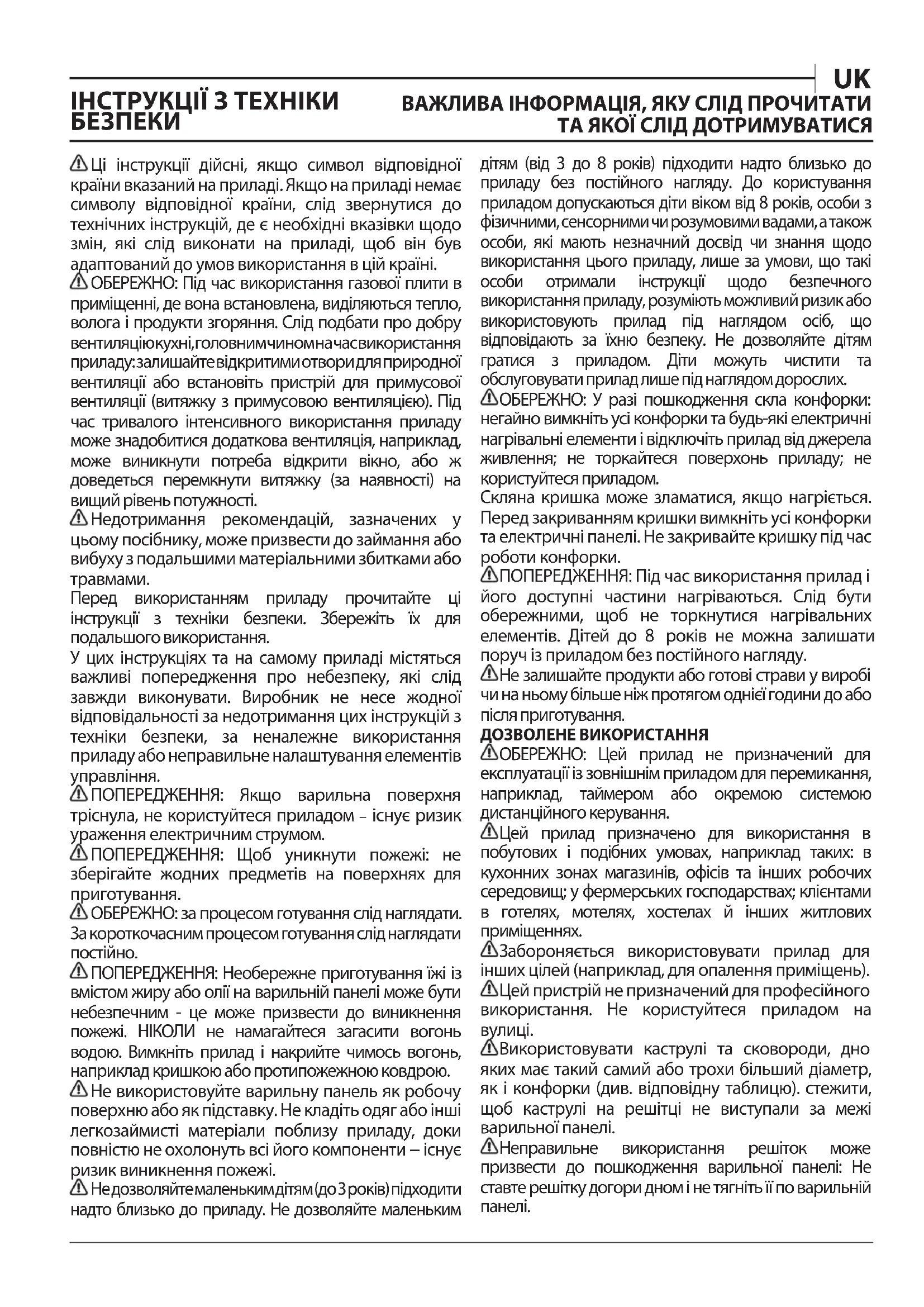 ПОПЕРЕДЖЕННЯ: Необережне приготування їжі із вмістом жиру або олії на варильній панелі може бути небезпечним - це може призвести до виникнення пожежі. НІКОЛИ не намагайтеся загасити вогонь водою. Вимкніть прилад і накрийте чимось вогонь, наприклад кришкою або протипожежною ковдрою. Не використовуйте варильну панель як робочу поверхню або як підставку. Не кладіть одяг або інші легкозаймисті матеріали поблизу приладу, доки повністю не охолонуть всі його компоненти − існує ризик виникнення пожежі. Не дозволяйте маленьким дітям (до 3 років) підходити надто близько до приладу. Не дозволяйте маленьким дітям (від 3 до 8 років) підходити надто близько до приладу без постійного нагляду. До користування приладом допускаються діти віком від 8 років, особи з фізичними, сенсорними чи розумовими вадами, а також особи, які мають незначний досвід чи знання щодо використання цього приладу, лише за умови, що такі особи отримали інструкції щодо безпечного використання приладу, розуміють можливий ризик або використовують прилад під наглядом осіб, що відповідають за їхню безпеку. Не дозволяйте дітям гратися з приладом. Діти можуть чистити та обслуговувати прилад лише під наглядом дорослих. ОБЕРЕЖНО: У разі пошкодження скла конфорки: негайно вимкніть усі конфорки та будь-які електричні нагрівальні елементи і відключіть прилад від джерела живлення; не торкайтеся поверхонь приладу; не користуйтеся приладом. Скляна кришка може зламатися, якщо нагріється. Перед закриванням кришки вимкніть усі конфорки та електричні панелі. Не закривайте кришку під час роботи конфорки. ПОПЕРЕДЖЕННЯ: Під час використання прилад і його доступні частини нагріваються. Слід бути обережними, щоб не торкнутися нагрівальних елементів. Дітей до 8 років не можна залишати поруч із приладом без постійного нагляду. Не залишайте продукти або готові страви у виробі чи на ньому більше ніж протягом однієї години до або після приготування. ДОЗВОЛЕНЕ ВИКОРИСТАННЯ ОБЕРЕЖНО: Цей прилад не призначений для експлуатації із зовнішнім приладом для перемикання, наприклад, таймером або окремою системою дистанційного керування. Цей прилад призначено для використання в побутових і подібних умовах, наприклад таких: в кухонних зонах магазинів, офісів та інших робочих середовищ; у фермерських господарствах; клієнтами в готелях, мотелях, хостелах й інших житлових приміщеннях. Забороняється використовувати прилад для інших цілей (наприклад, для опалення приміщень). Цей пристрій не призначений для професійного використання. Не користуйтеся приладом на