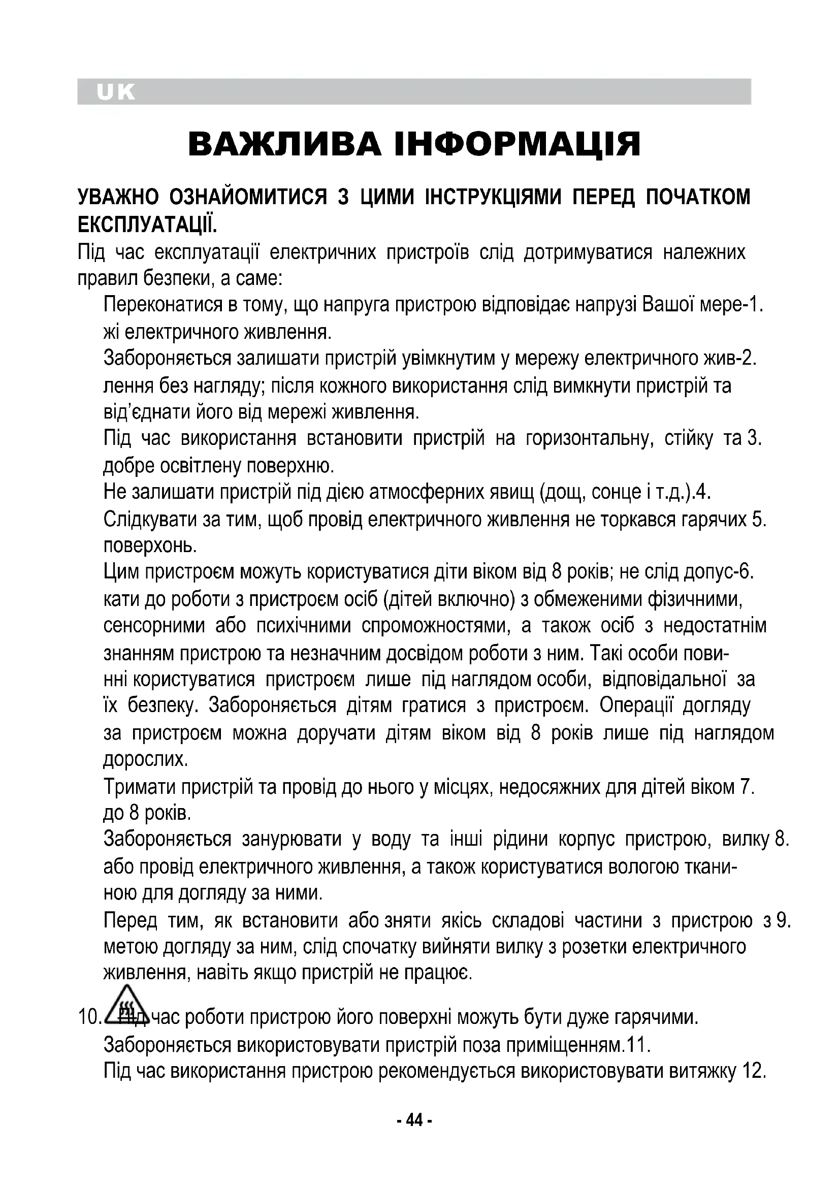 Забороняється використовувати пристрій поза приміщенням.11. Під час використання пристрою рекомендується використовувати витяжку 12.UK