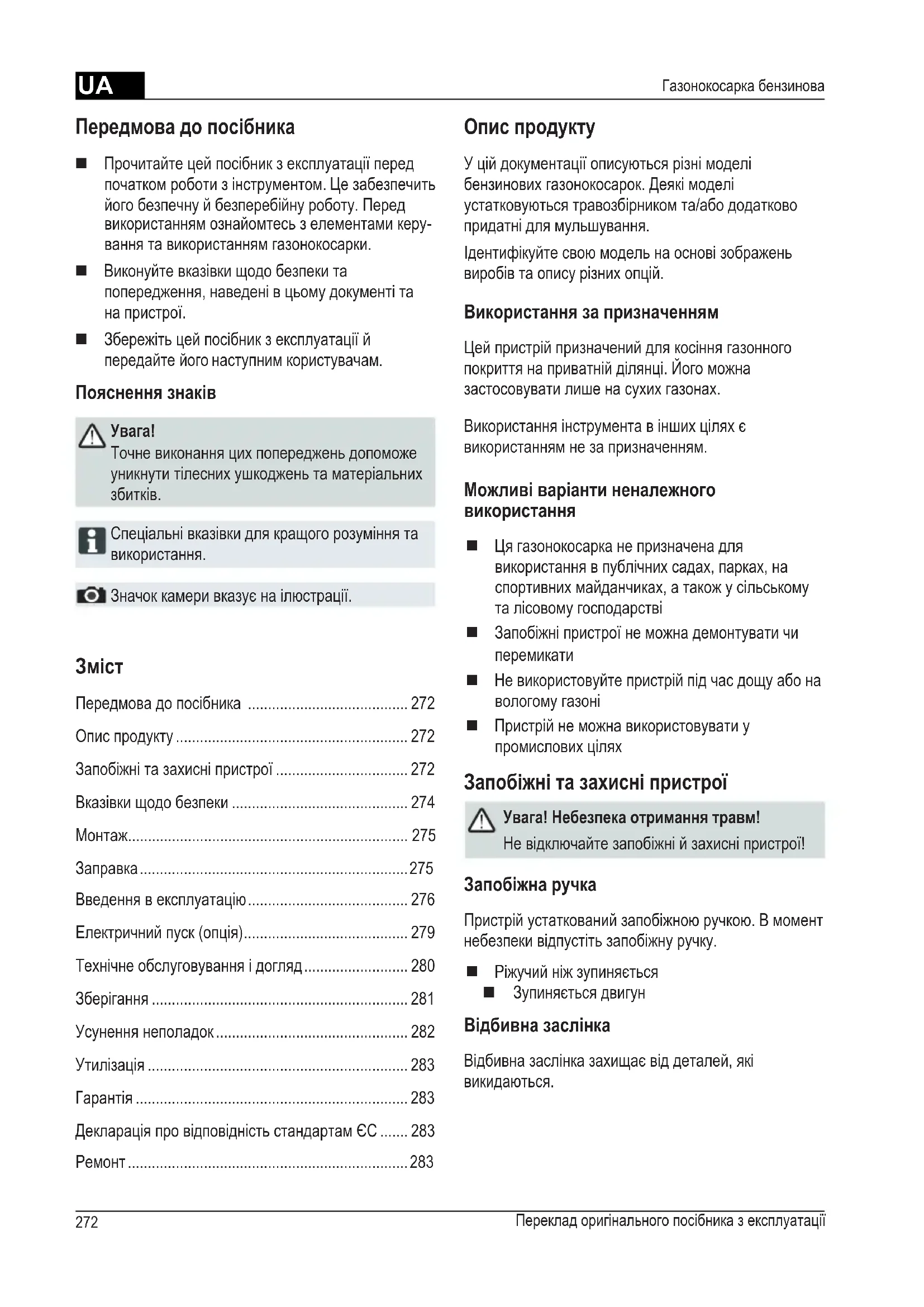 - Ремонт Передмова до посібника Прочитайте цей посібник з експлуатації перед початком роботи з інструментом. Це забезпечить його безпечну й безперебійну роботу. Перед використанням ознайомтесь з елементами керу- вання та використанням газонокосарки. Виконуйте вказівки щодо безпеки та попередження, наведені в цьому документі та на пристрої. Збережіть цей посібник з експлуатації й передайте його наступним користувачам. Пояснення знаків p. 283