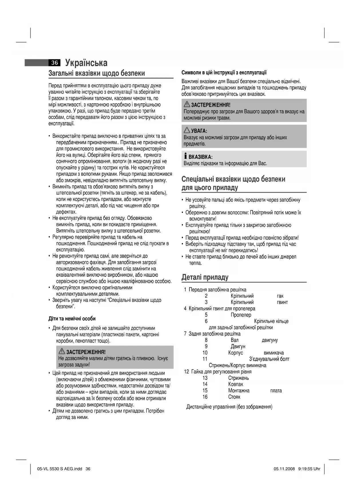 Деталі приладу 1 Передня запобіжна решітка 2 Кріпильний гак 3 Кріпильний гвинт 4 Кріпильний гвинт для пропелера 5 Пропелер 6 Кріпильне кільце для задньої запобіжної решітки 7 Задня запобіжна решітка 8 Вал двигуну 9 Двигун 10 Корпус вимикача 11 З’єднувальний болт Стрижень/Корпус вимикача 12 Гайка для регулювання рівня 13 Стрижень 14 Ковпак 15 Монтажна плата 16 Стояк Дистанційне управління (без зображення) 05-VL 5530 S AEG.indd 3605-VL 5530 S AEG.indd 36 05.11.2008 9:19:55 Uhr05.11.2008 9:19:55 UhrУкраїнська
