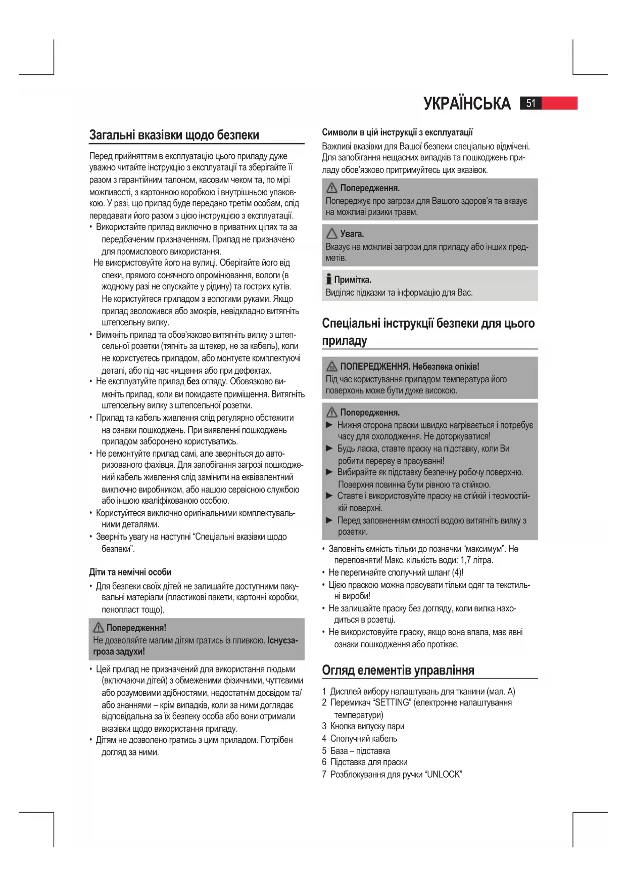 ПОПЕРЕДЖЕННЯ. Небезпека опіків! Під час користування приладом температура його поверхонь може бути дуже високою. Попередження. ► Нижня сторона праски швидко нагрівається і потребує часу для охолодження. Не доторкуватися! ► Будь ласка, ставте праску на підставку, коли Ви робити перерву в прасуванні! ► Вибирайте як підставку безпечну робочу поверхню. Поверхня повинна бути рівною та стійкою. ► Ставте і використовуйте праску на стійкій і термостій- кій поверхні. ► Перед заповненням ємності водою витягніть вилку з