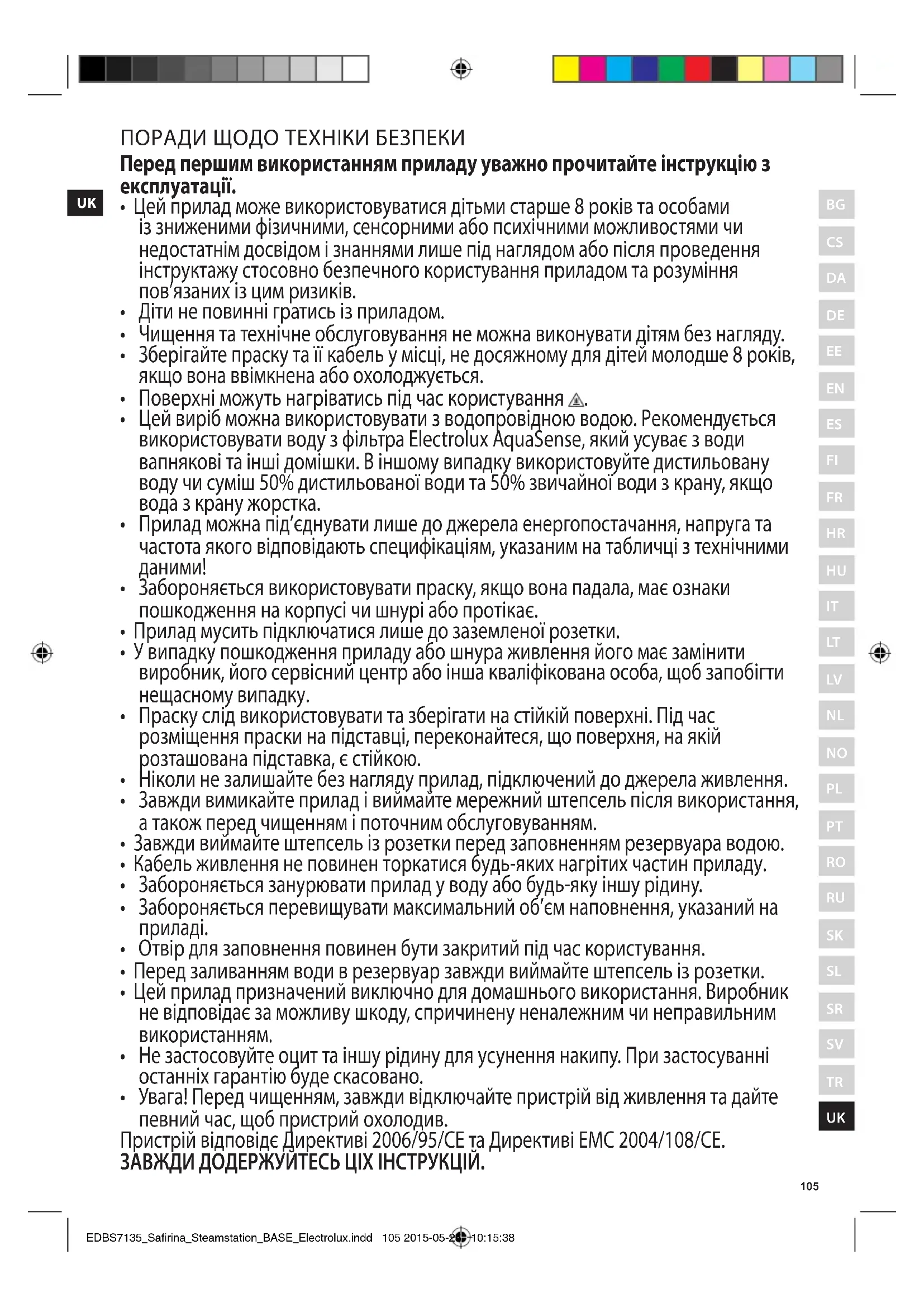 EDBS7135_Safirina_Steamstation_BASE_Electrolux.indd 104 2015-05-25 10:15:38UK ПОРАДИ ЩОДО ТЕХНІКИ БЕЗПЕКИ Перед першим використанням приладу уважно прочитайте інструкцію з експлуатації.