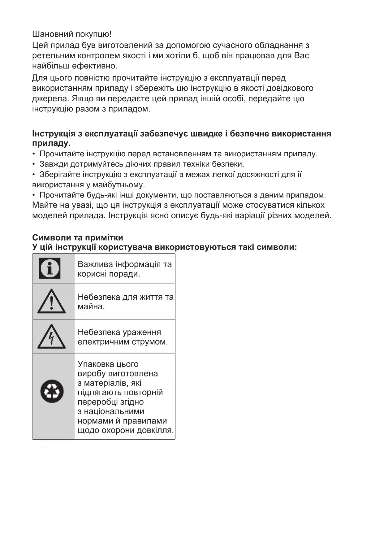 - Прочитайте будь-які інші документи, що поставляються з даним приладом. Майте на увазі, що ця інструкція з експлуатації може стосуватися кількох моделей прилада. Інструкція ясно описує будь-які варіації різних моделей. Символи та примітки У цій інструкції користувача використовуються такі символи:
