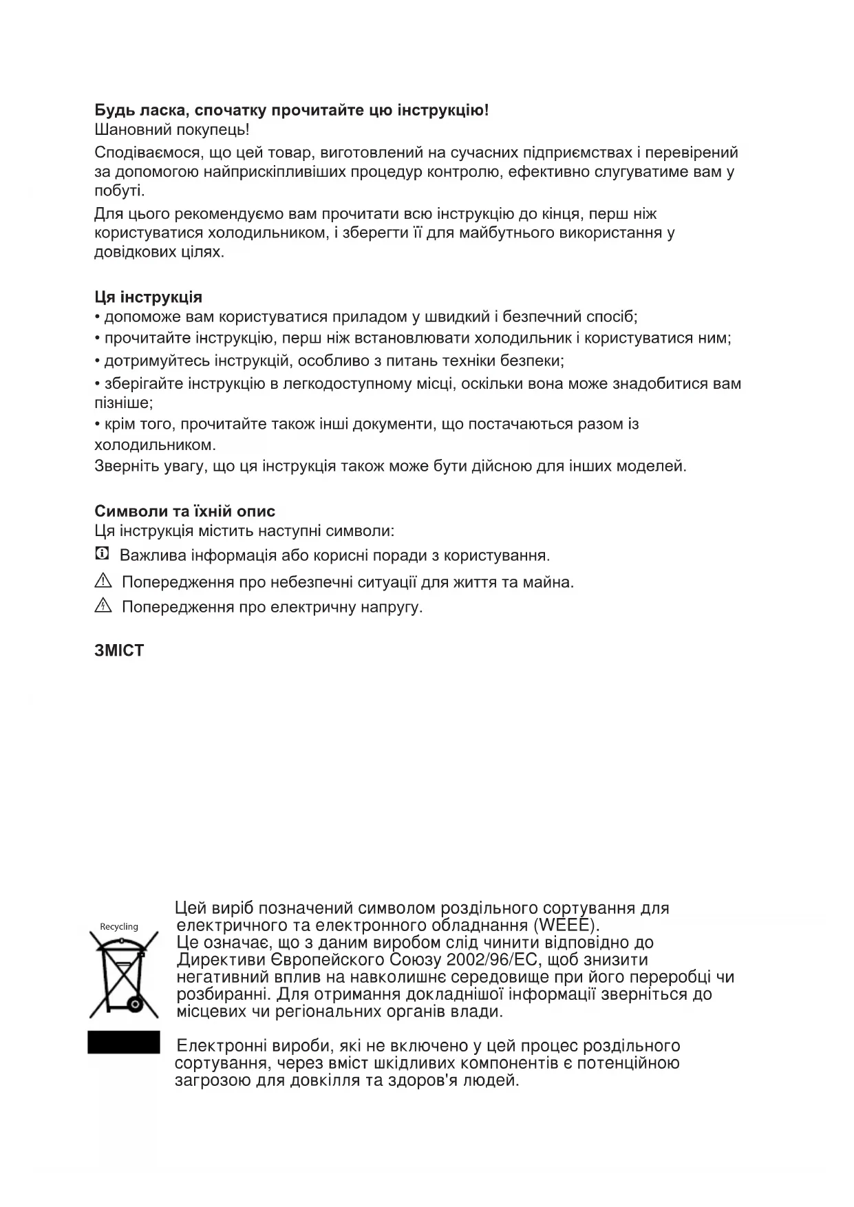 Для цього рекомендуємо вам прочитати всю інструкцію до кінця, перш ніж користуватися холодильником, і зберегти її для майбутнього використання у довідкових цілях. Ця інструкція