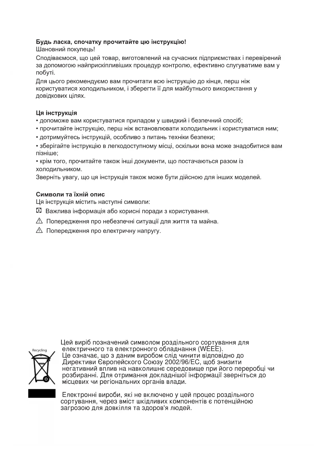 - крім того, прочитайте також інші документи, що постачаються разом із холодильником. Зверніть увагу, що ця інструкція також може бути дійсною для інших моделей. Символи та їхній опис Ця інструкція містить наступні символи: C Важлива інформація або корисні поради з користування. A Попередження про небезпечні ситуації для життя та майна. B Попередження про електричну напругу. Цей виріб позначений символом роздільного сортування для електричного та електронного обладнання (WEEE). Це означає, що з даним виробом слід чинити відповідно до Директиви Європейского Союзу 2002/96/EC, щоб знизити негативний вплив на навколишнє середовище при його переробці чи розбиранні. Для отримання докладнішої інформації зверніться до місцевих чи регіональних органів влади. Електронні вироби, які не включено у цей процес роздільного сортування, через вміст шкідливих компонентів є потенційною загрозою для довкілля та здоров'я людей. RecyclingUK
