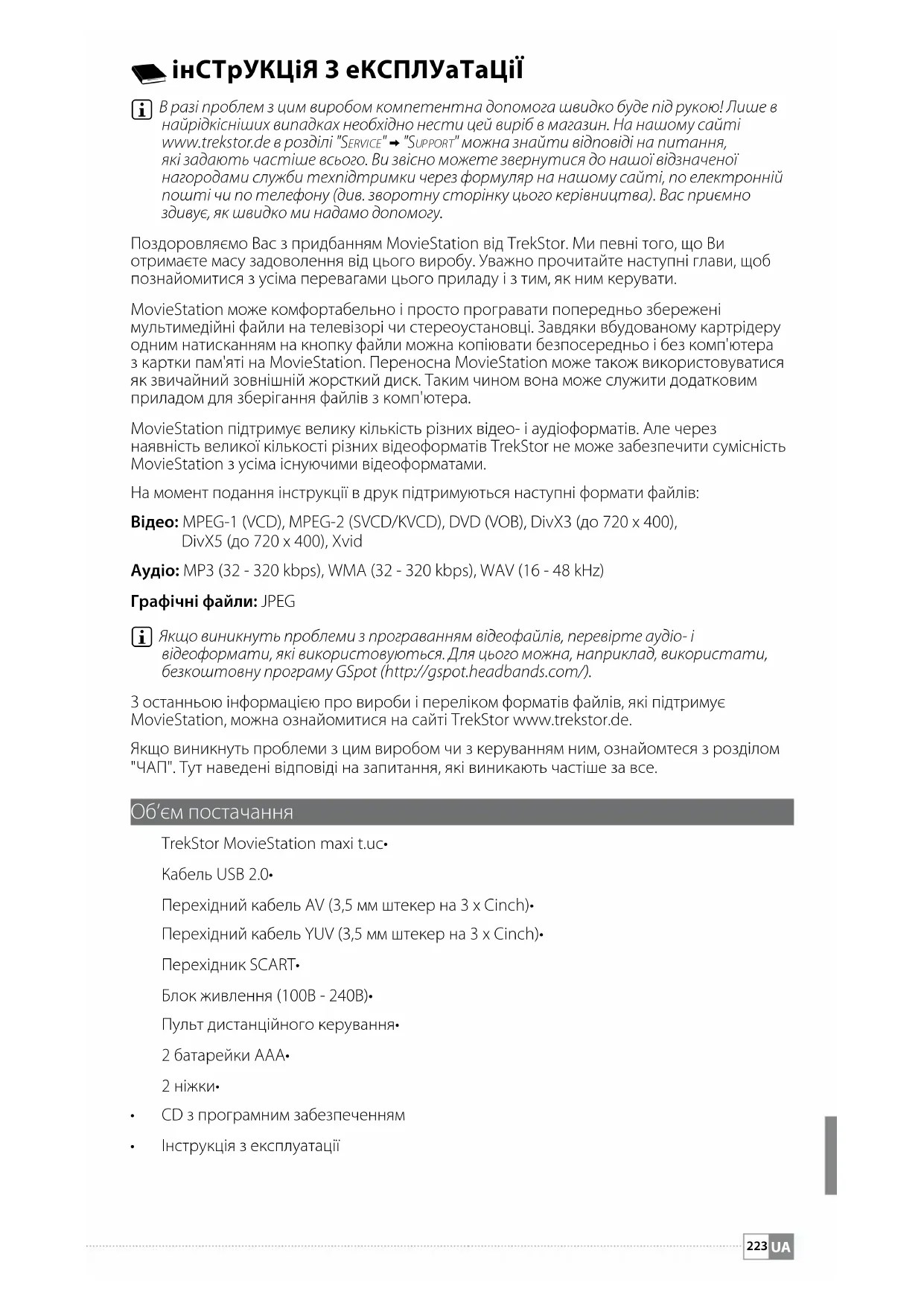 В разі проблем з цим виробом компетентна допомога швидко буде під рукою! Лише в найрідкісніших випадках необхідно нести цей виріб в магазин. На нашому сайті www.trekstor.de в розділі "Se r v i c e " + "Su p p o r t " можна знайти відповіді на питання, які задають частіше всього. Ви звісно можете звернутися до нашої відзначеної нагородами служби техпідтримки через формуляр на нашому сайті, по електронній пошті чи по телефону (див. зворотну сторінку цього керівництва). Вас приємно здивує, як швидко ми надамо допомогу. Поздоровляємо Вас з придбанням MovieStation від TrekStor. Ми певні того, що Ви отримаєте масу задоволення від цього виробу. Уважно прочитайте наступні глави, щоб познайомитися з усіма перевагами цього приладу і з тим, як ним керувати. MovieStation може комфортабельно і просто програвати попередньо збережені мультимедійні файли на телевізорі чи стереоустановці. Завдяки вбудованому картрідеру одним натисканням на кнопку файли можна копіювати безпосередньо і без комп'ютера з картки пам'яті на MovieStation. Переносна MovieStation може також використовуватися як звичайний зовнішній жорсткий диск. Таким чином вона може служити додатковим приладом для зберігання файлів з комп'ютера. MovieStation підтримує велику кількість різних відео- і аудіоформатів. Але через наявність великої кількості різних відеоформатів TrekStor не може забезпечити сумісність MovieStation з усіма існуючими відеоформатами. На момент подання інструкції в друк підтримуються наступні формати файлів: Відео: MPEG-1 (VCD), MPEG-2 (SVCD/KVCD), DVD (VOB), DivX3 (до 720 x 400), DivX5 (до 720 x 400), Xvid Аудіо: MP3 (32 - 320 kbps), WMA (32 - 320 kbps), WAV (16 - 48 kHz) Графічні файли: JPEG