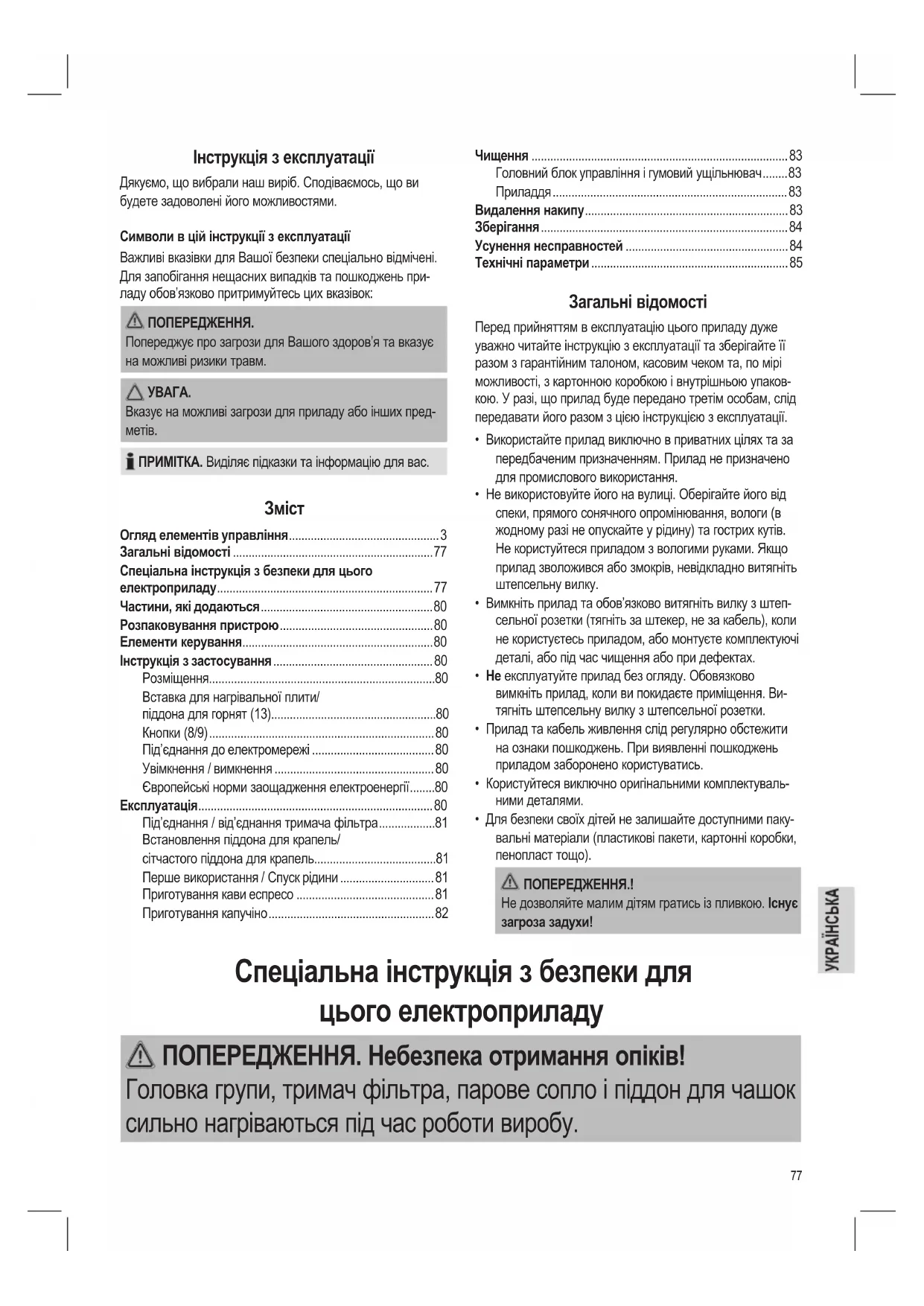 - Приготування капучіно Спеціальна інструкція з безпеки для цього електроприладу ПОПЕРЕДЖЕННЯ. Небезпека отримання опіків! Головка групи, тримач фільтра, парове сопло і піддон для чашок сильно нагріваються під час роботи виробу.78 ПОПЕРЕДЖЕННЯ. Небезпека отримання опіків! p. 82