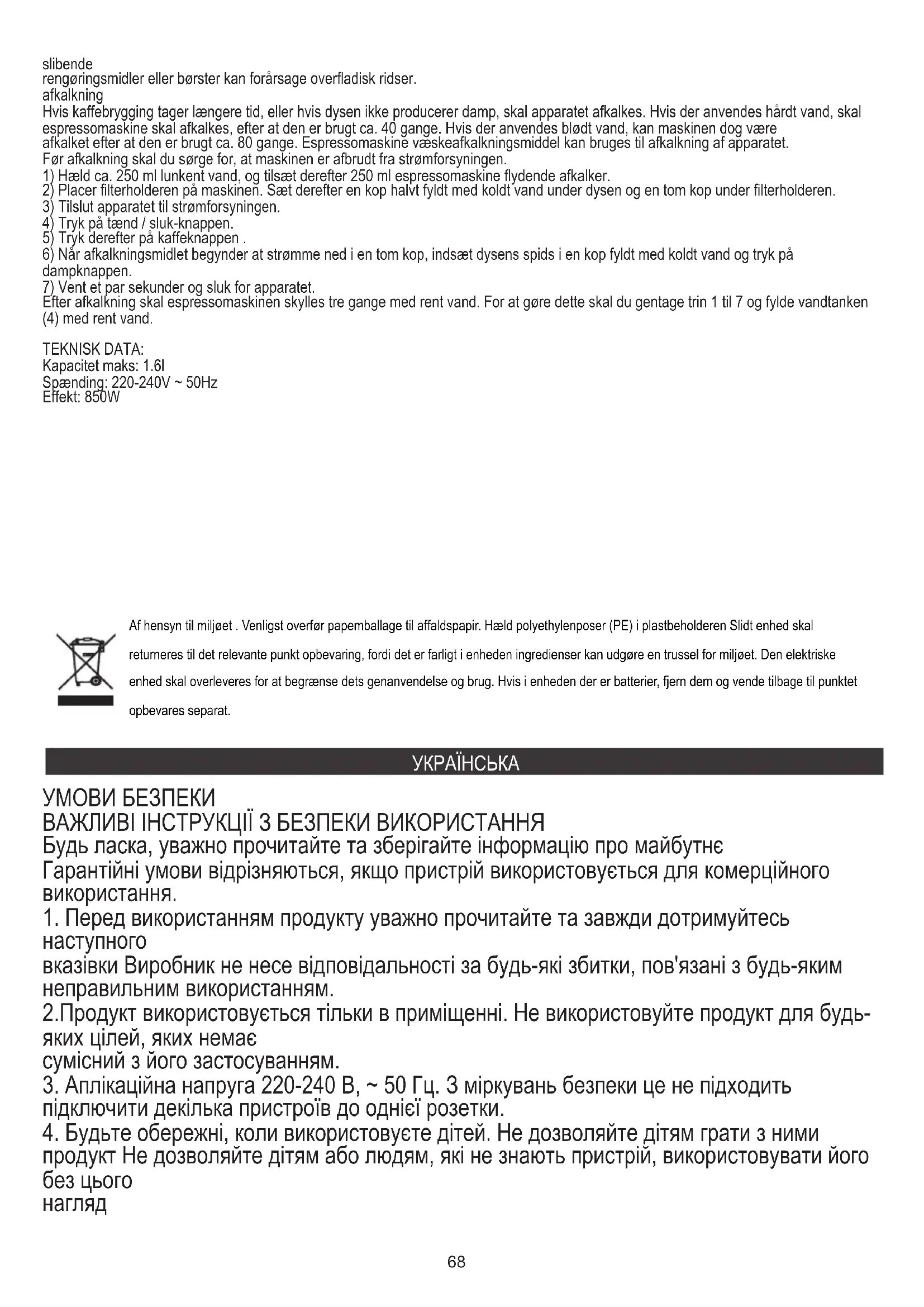 ОЧИЩЕННЯ ТА ОБСЛУГОВУВАННЯ ПРИМІТКА. Перед очищенням від'єднайте апарат від мережі та зачекайте, поки вона повністю охолоне. Від'єднайте власник фільтра та видаліть використану каву з фільтра. Якщо отвори фільтра забиті кавою, використовуйте пензель для очищення. Якщо отвори в держателе фільтра забиті, чистіть щіткою. Завжди спорожніть водяний резервуар після використання. Час від часу чистіть воду Танк з вологістю губки або тканини. Чашки, резервуар для води, смітник, лоток для піддона, фільтр та фільтр можуть бути промиті водою з деякими м'який миючий засіб без абразивних речовин або розчинників. Зовнішні частини слід чистити м'якою ганчіркою або губкою. Високоабразивний чистячі засоби чи щітки можуть спричинити подряпини поверхні. DECALCIFICATION71 Якщо кава заварювання займає більше часу або сопла не виробляється пар, пристрій має бути декальційованим. Якщо використовується жорстка вода, то Еспрессо-машину слід обезжвити ісля того, як його було використано приблизно в 40 разів. Однак, якщо використовується м'яка вода, машина може бути декальцифіровано після того, як його було використано приблизно 80 разів. Еспрессо-верстат рідини декальцифікатор може використовуватися для відкалібровки приладу. Перш ніж відколювати, переконайтеся, що пристрій від'єднано від джерела живлення.
