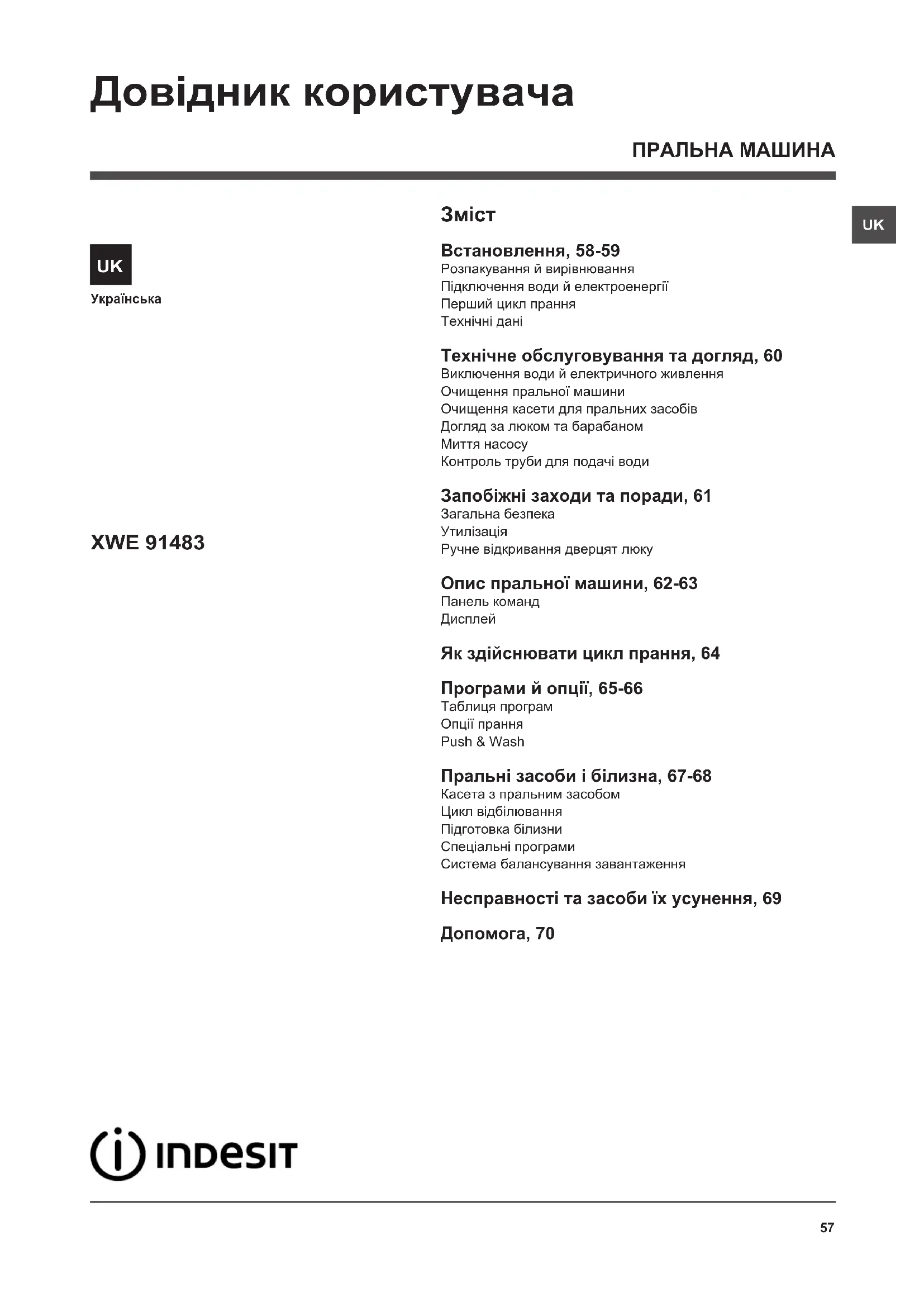Як здійснювати цикл прання, 64 Програми й опції, 65-66 Таблиця програм Опції прання Push & Wash Пральні засоби і білизна, 67-68 Касета з пральним засобом Цикл вiдбiлювання Підготовка білизни Спецiальнi програми Система балансування завантаження Несправності та засоби їх усунення, 69 Допомога, 70 XWE 91483 Довiдник користувача58