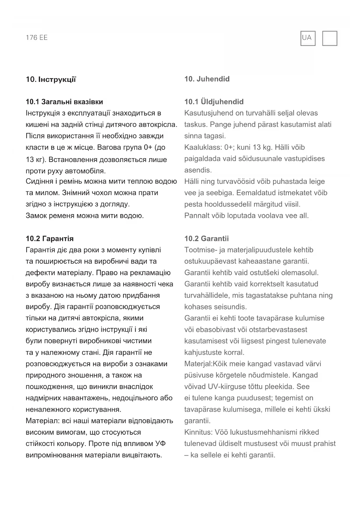 Виріб призначений виключно для використання в автомобілях, обладнаних трьохточковими ременями безпеки згідно положення ЕСЕ №16 або інших відповідних стандартів. Автокрісло відноситься до вікової категорії 0+ і розраховане на дітей віком до 18 місяців з вагою тіла до 13 кг. Виробник залишає за собою право на друкарські помилки, похибки та технiчнi змiни. Увага: обов’язково збережіть цю інструкцію. Вона може знадобиться Вам пізніше. Для зберігання інструкції на зворотному боці дитячого автокрісла знаходиться спеціальна кишеня. Sobib kasutamiseks vaid sõidukites, millel on heakskiidetud kolmepunktilise kinnitusega turvavööd, mis vastavad ECE määrusele nr 16 jm samaväärsetele standarditele. Iste sobib 0+ kaaluklassi lastele vanuses kuni 18 kuud ning kaaluga kuni 13 kg. Tootel võib esineda trükivigu, eksimusi ning tehnilisi muudatusi. TÄHELEPANU! Säilitage juhend tuleviku tarbeks. Istme seljal on juhendi hoidmiseks mõeldud tasku. PRIVIA EVO Вікова група 0+ згідно ECE · до 13 кг ECE - grupp 0+ vanusegrupp, sünnist 13 kg-ni137