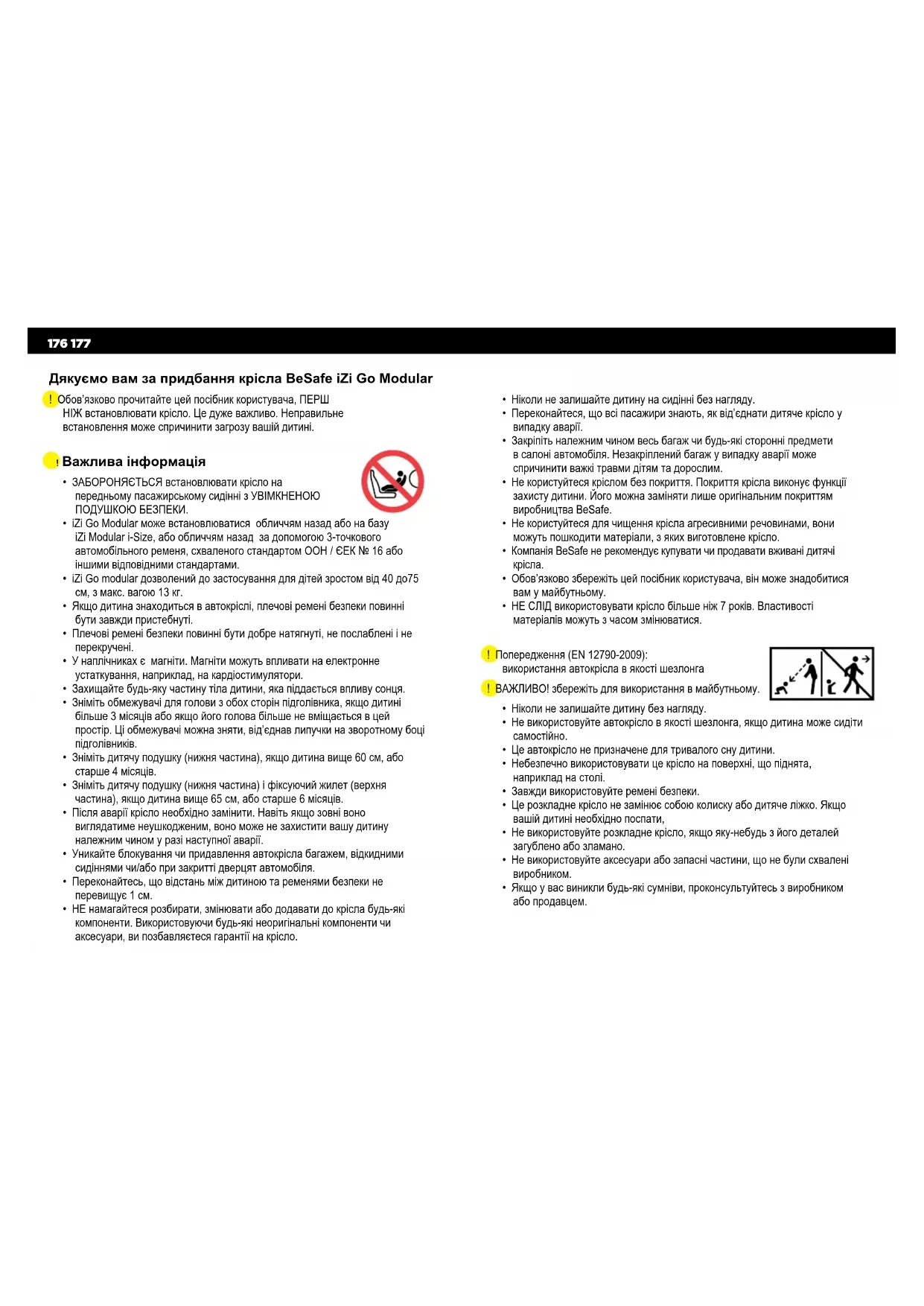 - НЕ намагайтеся розбирати, змінювати або додавати до крісла будь-які компоненти. Використовуючи будь-які неоригінальні компоненти чи аксесуари, ви позбавляєтеся гарантії на крісло. Дякуємо вам за придбання крісла BeSafe iZi Go Modular ! Обов’язково прочитайте цей посібник користувача, ПЕРШ НІЖ встановлювати крісло. Це дуже важливо. Неправильне встановлення може спричинити загрозу вашій дитині.