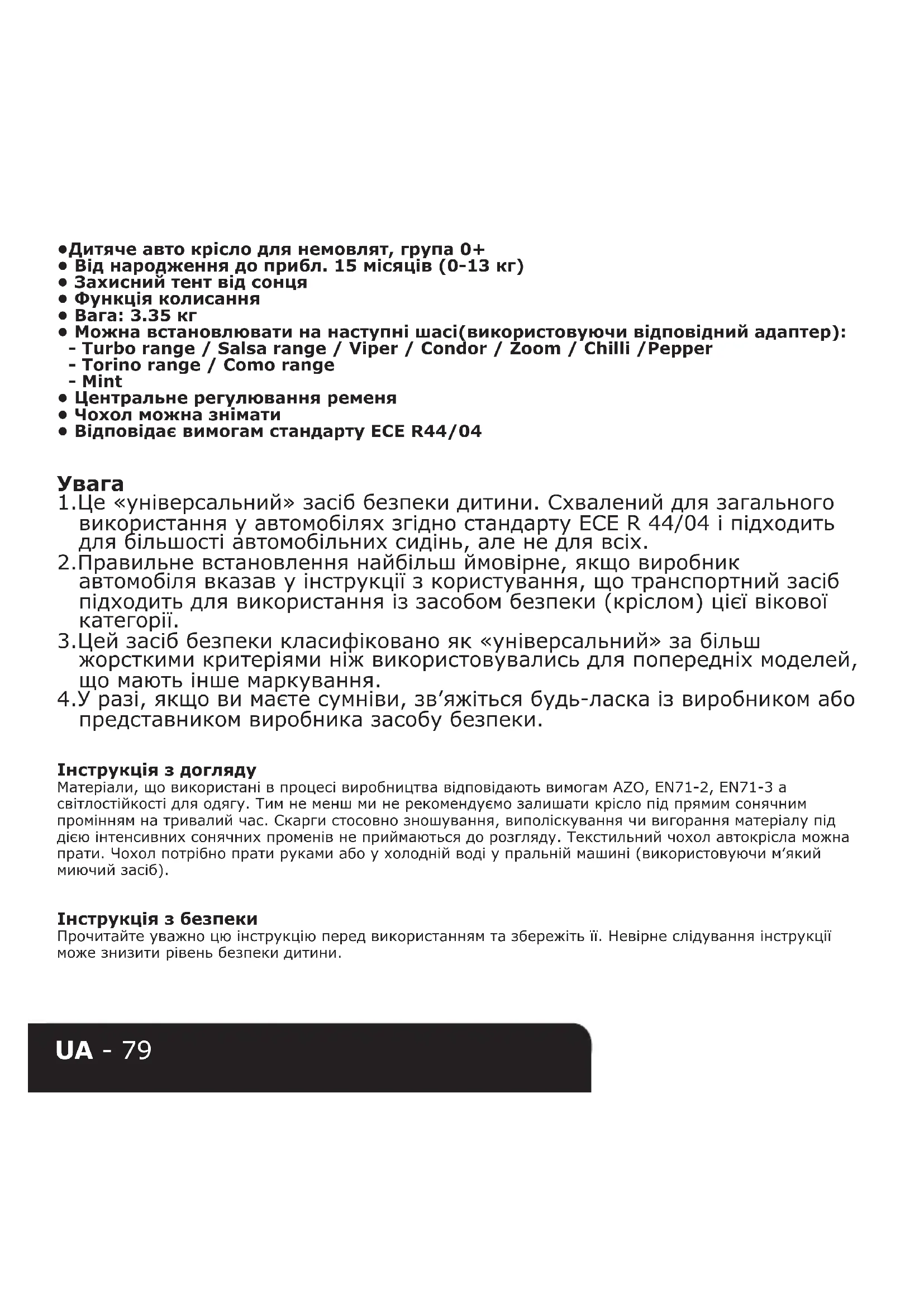 3.Цей засіб безпеки класифіковано як «універсальний» за більш жорсткими критеріями ніж використовувались для попередніх моделей, що мають інше маркування. 4.У разі, якщо ви маєте сумніви, зв’яжіться будь-ласка із виробником або представником виробника засобу безпеки. Інструкціяздогляду Матеріали, що використані в процесі виробництва відповідають вимогам AZO, EN71-2, EN71-3 а світлостійкості для одягу. Тим не менш ми не рекомендуємо залишати крісло під прямим сонячним промінням на тривалий час. Скарги стосовно зношування, виполіскування чи вигорання матеріалу під дією інтенсивних сонячних променів не приймаються до розгляду. Текстильний чохол автокрісла можна прати. Чохол потрібно прати руками або у холодній воді у пральній машині (використовуючи м’який миючий засіб). Інструкціязбезпеки Прочитайте уважно цю інструкцію перед використанням та збережіть її. Невірне слідування інструкції може знизити рівень безпеки дитини.UA - 80