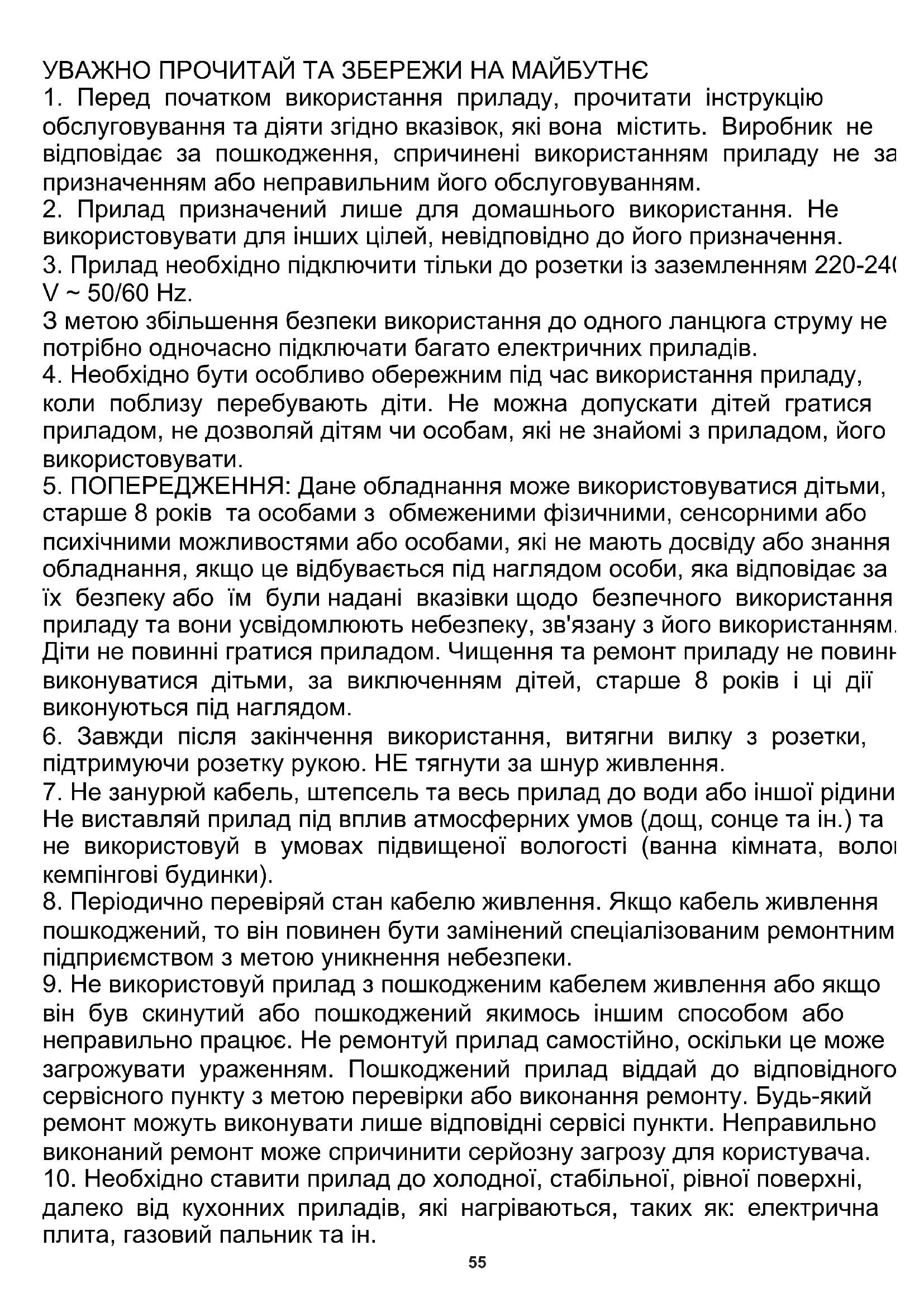 далеко від кухонних приладів, які нагріваються, таких як: електрична плита, газовий пальник та ін. 5511. Не користуватися приладом біля легкозаймистих матеріалів.
