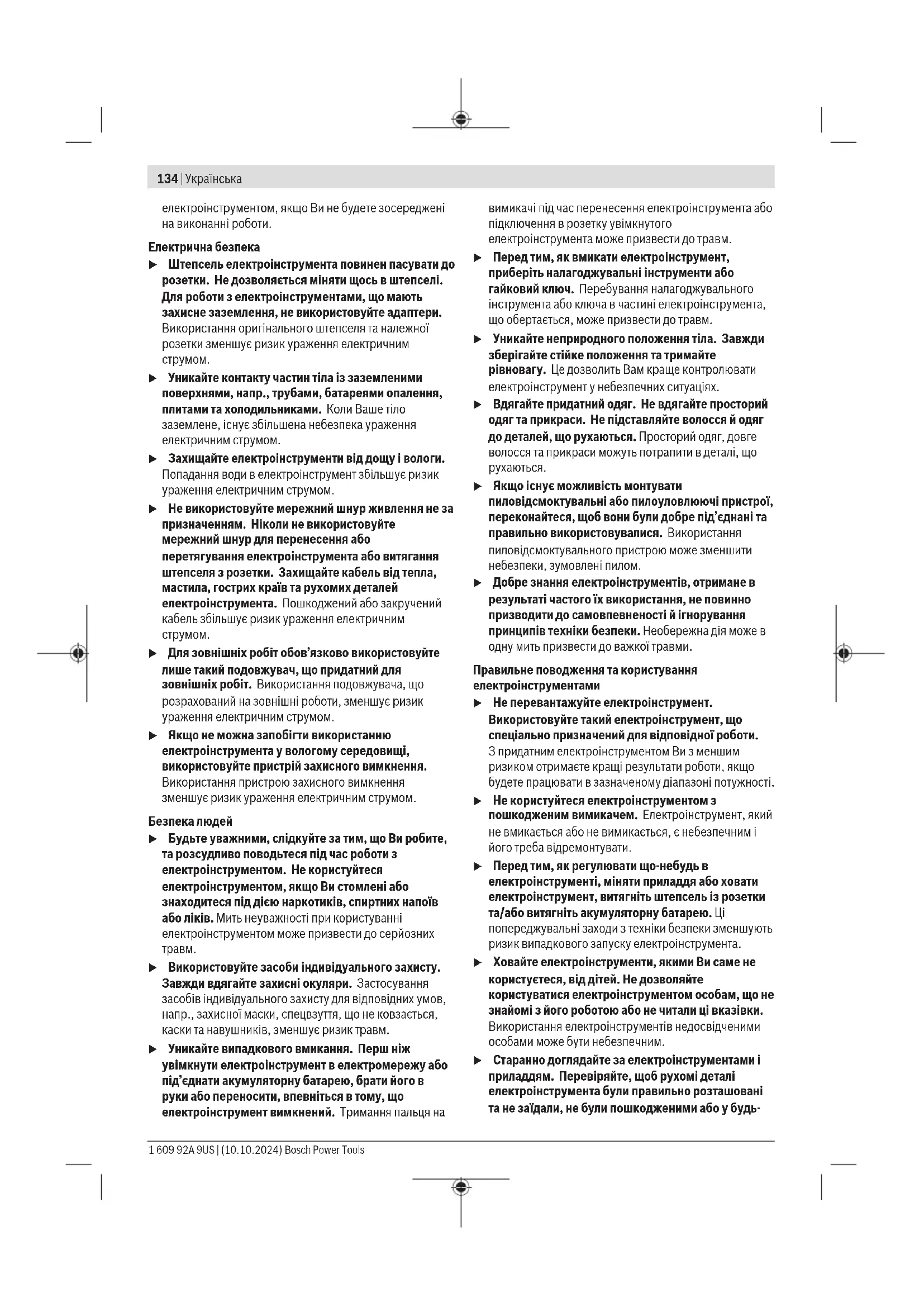 u Якщо існує можливість монтувати пиловідсмоктувальні або пилоуловлюючі пристрої, переконайтеся, щоб вони були добре під’єднані та правильно використовувалися. Використання пиловідсмоктувального пристрою може зменшити небезпеки, зумовлені пилом. u Добре знання електроінструментів, отримане в результаті частого їх використання, не повинно призводити до самовпевненості й ігнорування принципів техніки безпеки. Необережна дія може в одну мить призвести до важкої травми. Правильне поводження та користування електроінструментами u Не перевантажуйте електроінструмент. Використовуйте такий електроінструмент, що спеціально призначений для відповідної роботи. Зпридатним електроінструментом Ви з меншим ризиком отримаєте кращі результати роботи, якщо будете працювати в зазначеному діапазоні потужності. u Не користуйтеся електроінструментом з пошкодженим вимикачем. Електроінструмент, який не вмикається або не вимикається, є небезпечним і його треба відремонтувати. u Перед тим, як регулювати що-небудь в електроінструменті, міняти приладдя або ховати електроінструмент, витягніть штепсель із розетки та/або витягніть акумуляторну батарею. Ці попереджувальні заходи з техніки безпеки зменшують ризик випадкового запуску електроінструмента. u Ховайте електроінструменти, якими Ви саме не користуєтеся, від дітей. Не дозволяйте користуватися електроінструментом особам, що не знайомі з його роботою або не читали ці вказівки. Використання електроінструментів недосвідченими особами може бути небезпечним. u Старанно доглядайте за електроінструментами і приладдям. Перевіряйте, щоб рухомі деталі електроінструмента були правильно розташовані та не заїдали, не були пошкодженими або у будь- 1 609 92A 9US | (10.10.2024) Bosch Power ToolsУкраїнська | 135 якому іншому стані, який міг би вплинути на функціонування електроінструмента. Пошкоджені електроінструменти потрібно відремонтувати, перш ніж користуватися ними знову. Велика кількість нещасних випадків спричиняється поганим доглядом за електроінструментами. u Тримайте різальні інструменти нагостреними та в чистоті. Старанно доглянуті різальні інструменти з гострим різальним краєм менше застряють та легші в експлуатації. u Використовуйте електроінструмент, приладдя до нього, робочі інструменти тощо відповідно до цих вказівок. Беріть до уваги при цьому умови роботи та специфіку виконуваної роботи. Використання електроінструментів для робіт, для яких вони не передбачені, може призвести до небезпечних