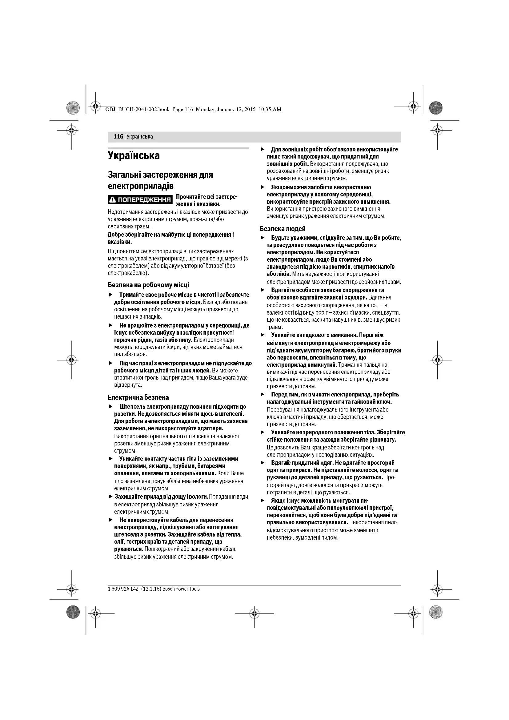 те придатний одяг. Не вдягайте просторий одяг та прикраси. Не підставляйте волосся, одяг та рукавиці до деталей приладу, що рухаються. Про- сторий одяг, довге волосся та прикраси можуть потрапити в деталі, що рухаються. Якщо існує можливість монтувати пи- ловідсмоктувальні або пилоуловлюючі пристрої, переконайтеся, щоб вони були добре під’єднані та правильно використовувалися. Використання пило- відсмоктувального пристрою може зменшити небезпеки, зумовлені пилом. OBJ_BUCH-2041-002.book Page 116 Monday, January 12, 2015 10:35 AMУкраїнська | 117 Bosch Power Tools 1 609 92A 14Z | (12.1.15) Правильне поводження та користування електроприладами Не перевантажуйте прилад. Використовуйте такий прилад, що спеціально призначений для відповідної роботи. З придатним приладом Ви з меншим ризиком отримаєте кращі результати роботи, якщо будете працювати в зазначеному діапазоні потужності. Не користуйтеся електроприладом з пошкодженим вимикачем. Електроприлад, який не можна увімкнути або вимкнути, є небезпечним і його треба відремонтувати. Перед тим, як регулювати що-небудь на приладі, міняти приладдя або ховати прилад, витягніть штепсель із розетки та/або витягніть акумуляторну батарею. Ці попереджувальні заходи з техніки безпеки зменшують ризик випадкового запуску приладу. Ховайте електроприлади, якими Ви саме не користуєтесь, від дітей. Не дозволяйте користуватися електроприладом особам, що не знайомі з його роботою або не читали ці вказівки. У разі застосування недосвідченими особами прилади несуть в собі небезпеку. Старанно доглядайте за електроприладом. Перевіряйте, щоб рухомі деталі приладу бездоганно працювали та не заїдали, не були пошкодженими або настільки пошкодженими, щоб це могло вплинути на функціонування електроприладу. Пошкоджені деталі треба відремонтувати, перш ніж користуватися ними знов. Велика кількість нещасних випадків спричиняється поганим доглядом за електроприладами. Тримайте різальні інструменти нагостреними та в чистоті. Ст аранно доглянуті різальні інструменти з