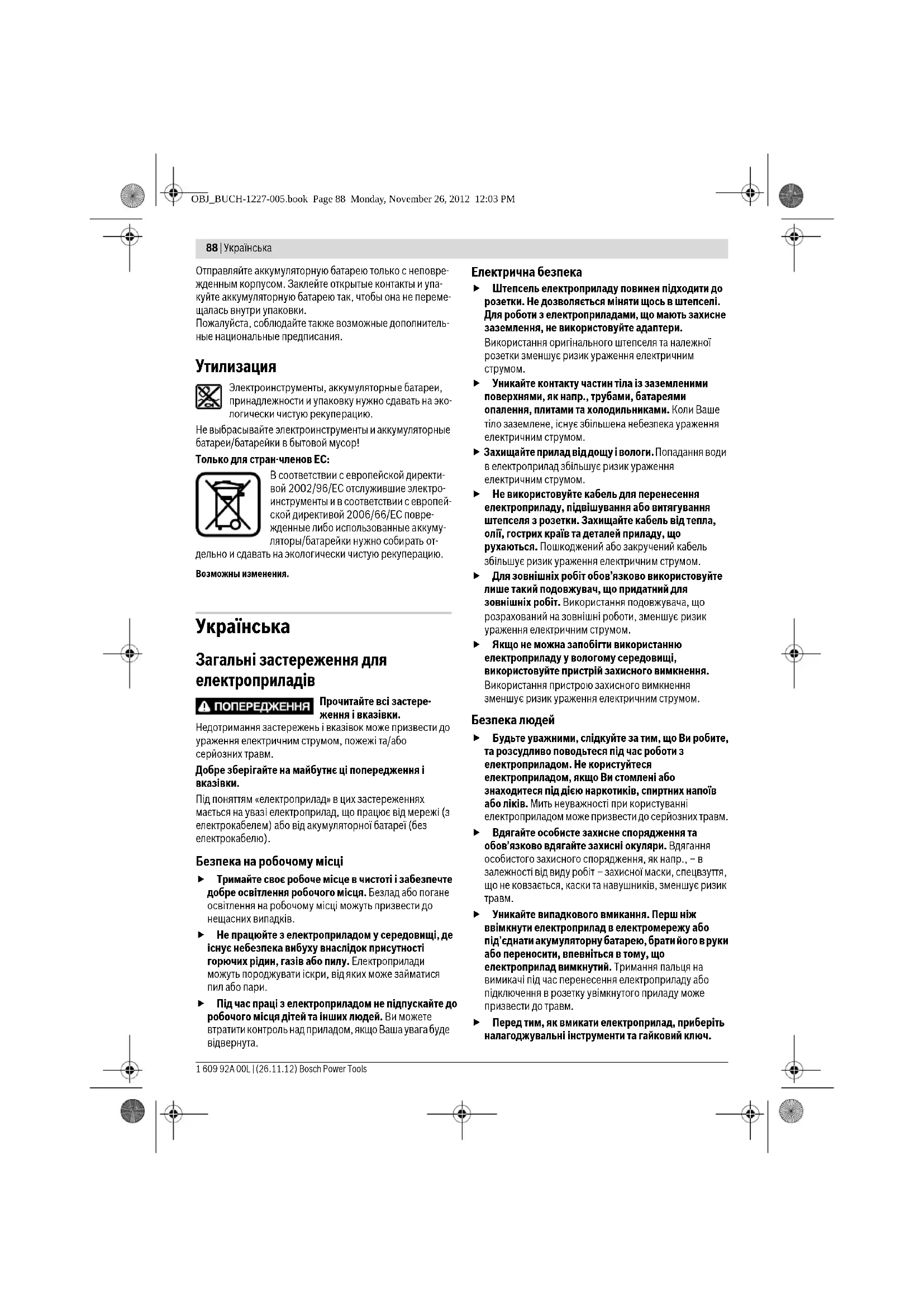 Уникайте випадкового вмикання. Перш ніж ввімкнути електроприлад в електромережу або під’єднати акумуляторну батарею, брати його в руки або переносити, впевніться в тому, що електроприлад вимкнутий. Тримання пальця на вимикачі під час перенесення електроприладу або підключення в розетку увімкнутого приладу може призвести до травм. Перед тим, як вмикати електроприлад, приберіть налагоджувальні інструменти та гайковий ключ. OBJ_BUCH-1227-005.book Page 88 Monday, November 26, 2012 12:03 PMУкраїнська | 89 Bosch Power Tools 1 609 92A 00L | (26.11.12) Перебування налагоджувального інструмента або ключа в частині приладу, що обертається, може призвести до травм. Уникайте неприродного положення тіла. Зберігайте стійке положення та завжди зберігайте рівновагу. Це дозволить Вам краще зберігати контроль над електроприладом у несподіваних ситуаціях. Вдягайте придатний одяг. Не вдягайте просторий одяг та прикраси. Не підставляйте волосся, одяг та рукавиці до деталей приладу, що рухаються. Про- сторий одяг, довге волосся та прикраси можуть потрапити в деталі, що рухаються. Якщо існує можливість монтувати пи- ловідсмоктувальні або пилоуловлюючі пристрої, переконайтеся, щоб вони були добре під’єднані та правильно використовувалися. Використання пило- відсмоктувального пристрою може зменшити небезпеки, зумовлені пилом. Правильне поводження та користування електроприладами Не перевантажуйте прилад. Використовуйте такий прилад, що спеціально призначений для відповідної роботи. З придатним приладом Ви з меншим ризиком отримаєте кращі результати роботи, якщо будете працювати в зазначеному діапазоні потужності. Не користуйтеся електроприладом з пошкодженим вимикачем. Електроприлад, який не можна увімкнути або вимкнути, є небезпечним і його треба відремонтувати. Перед тим, як регулювати що-небудь на приладі, міняти приладдя або ховати прилад, витягніть штепсель із розетки та/або витягніть акумуляторну батарею. Ці попереджувальні заходи з техніки безпеки зменшують ризик випадкового запуску приладу. Ховайте електроприлади, якими Ви саме не користуєтесь, від дітей. Не дозволяйте користуватися електроприладом особам, що не знайомі з його роботою або не читали ці вказівки. У разі застосування недосвідченими особами прилади несуть в собі небезпеку. Старанно доглядайте за електроприладом. Перевіряйте, щоб рухомі деталі приладу бездоганно працювали та не заїдали, не були пошкодженими або настільки пошкодженими, щоб це могло вплинути на функціонування електроприладу. Пошкоджені деталі треба відремонтувати, перш ніж користуватися ними знов. Велика кількість нещасних випадків спричиняється поганим доглядом за електроприладами. Тримайте різальні інструменти нагостреними та в чистоті. Старанно доглянуті рі зальні інструменти з гострим різальним краєм менше застряють та легші в експлуатації. Використовуйте електроприлад, приладдя до нього, робочі інструменти т.і. відповідно до цих вказівок. Беріть до уваги при цьому умови роботи та спе- цифіку виконуваної роботи. Використання електроприладів для робіт, для яких вони не передбачені, може призвести до небезпечних ситуацій. Правильне поводження та користування приладами, що працюють на акумуляторних