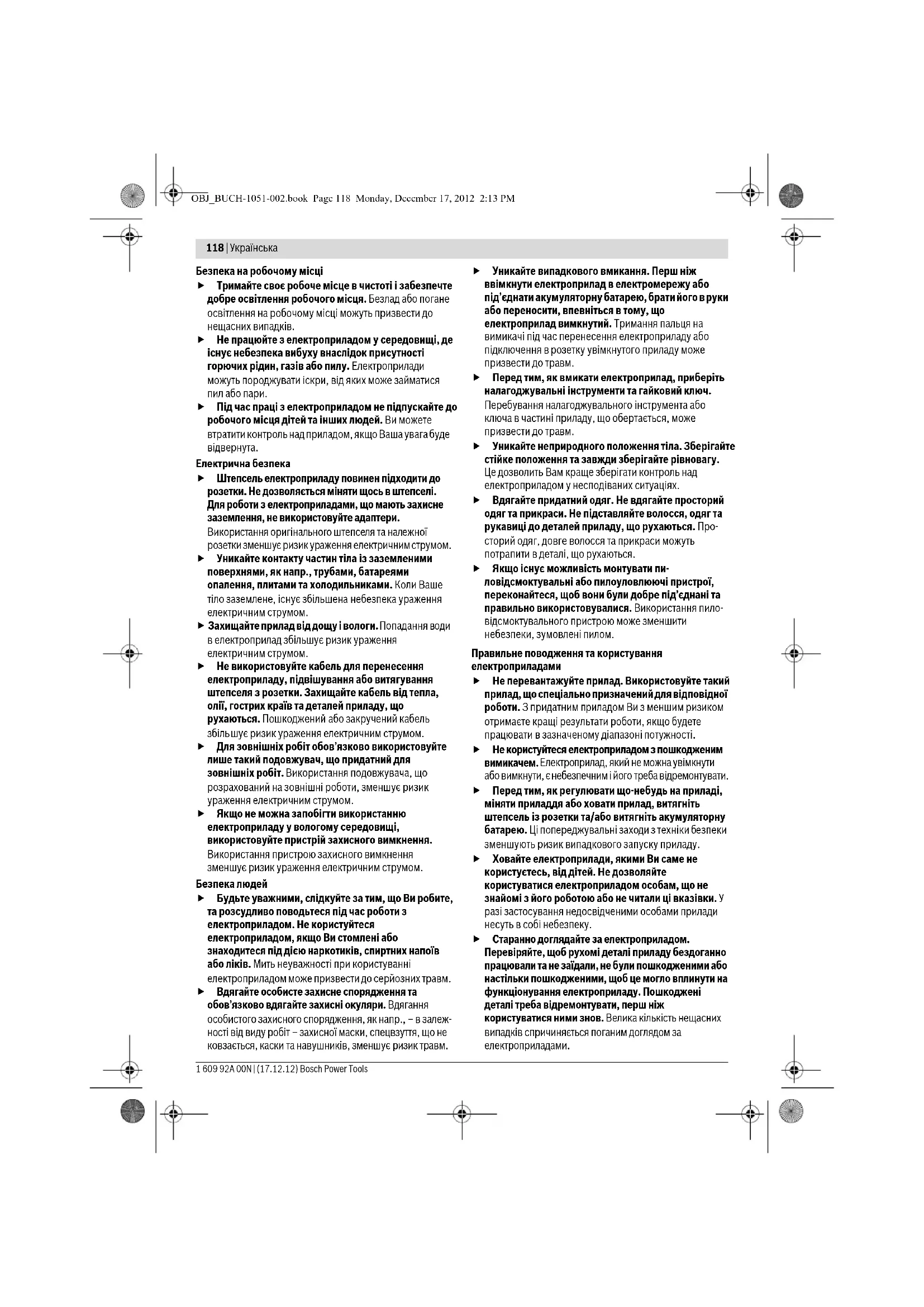 Під поняттям «електроприлад» в цих застереженнях мається на увазі електроприлад, що працює від мережі (з електрокабелем) або від акумуляторної батареї (без електрокабелю). OBJ_BUCH-1051-002.book Page 117 Monday, December 17, 2012 2:13 PM118 | Українська 1 609 92A 00N | (17.12.12) Bosch Power Tools Безпека на робочому місці Тримайте своє робоче місце в чистоті і забезпечте добре освітлення робочого місця. Безлад або погане освітлення на робочому місці можуть призвести до нещасних випадків. Не працюйте з електроприладом у середовищі, де існує небезпека вибуху внаслідок присутності горючих рідин, газів або пилу. Електроприлади можуть породжувати іскри, від яких може займатися пил або пари. Під час праці з електроприладом не підпускайте до робочого місця дітей та інших людей. Ви можете втратити контроль над приладом, якщо Ваша увага буде відвернута. Електрична безпека Штепсель електроприладу повинен підходити до розетки. Не дозволяється міняти щось в штепселі. Для роботи з електроприладами, що мають захисне заземлення, не використовуйте адаптери. Використання оригінального штепселя та належної розетки зменшує ризик ураження електричним струмом. Уникайте контакту частин тіла із заземленими поверхнями, як напр., трубами, батареями опалення, плитами та холодильниками. Коли Ваше тіло заземлене, існує збільшена небезпека ураження електричним струмом. Захищайте прилад від дощу і вологи. Попадання води в електроприлад збільшує ризик ураження електричним струмом. Не використовуйте кабель для перенесення електроприладу, підвішування або витягування штепселя з розетки. Захищайте кабель від тепла, олії, гострих країв та деталей приладу, що рухаються. Пошкоджений або закручений кабель