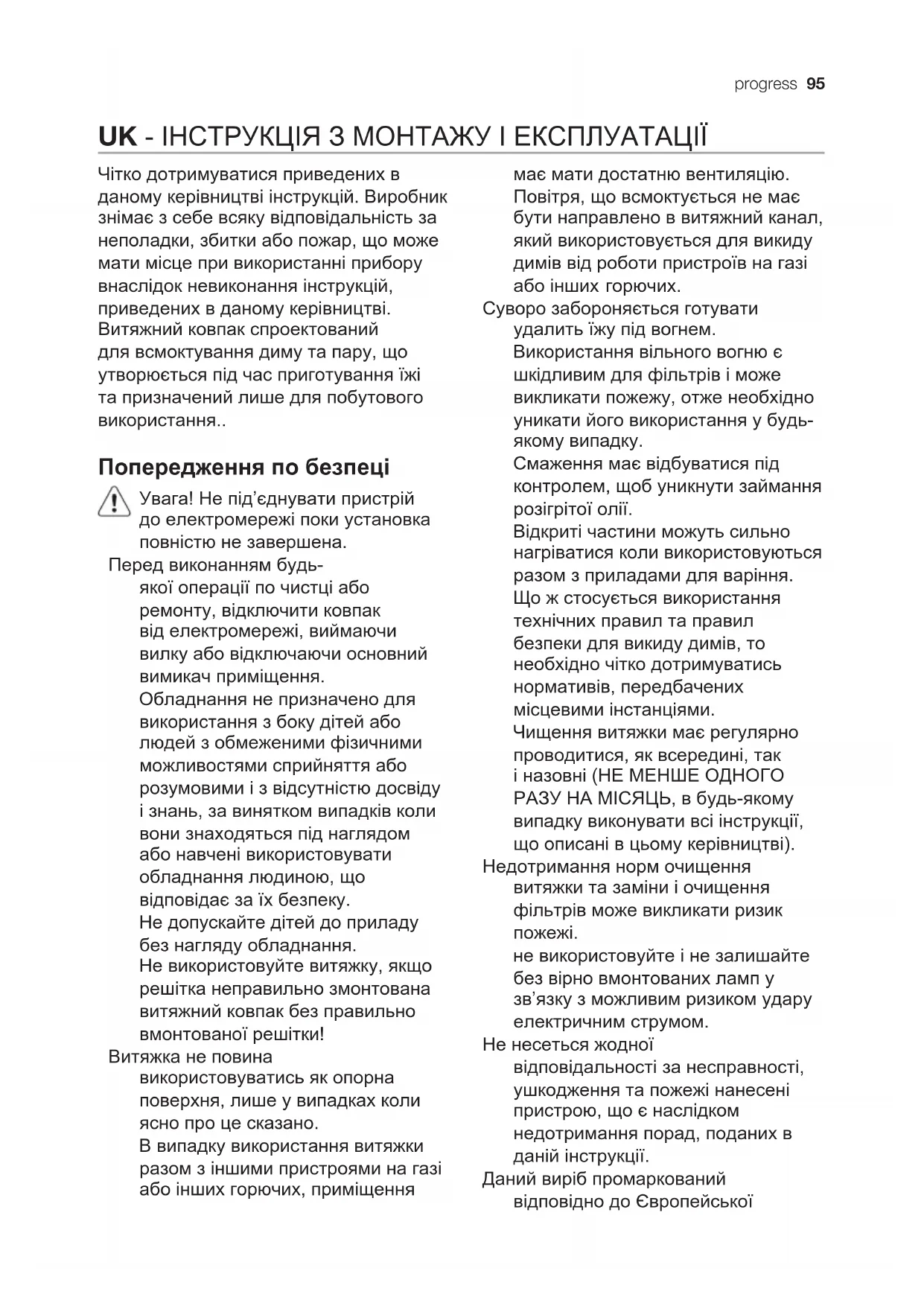 ALKOHOLI! Tähelepanu! Seadme puhastamise ja filtrite vahetamise eeskirjade mittejärgimisega kaasneb tulekahju oht. Seepärast on soovitatav järgida antud juhiseid. Me ei võta endale mingit vastutust ebaõigest käsitsemisest või eespool toodud ettevaatusabinõude eiramisest tingitud võimalike mootorikahjustuste ja tulekahjude eest.94 progress Rasvafi lter Joonis 1-17 Seda tuleb kord kuus mittesööbivate puhastusvahenditega puhastada kas käsitsi või nõudepesumasinas madala temperatuuri ja lühikese tsükliga. Nõudepesumasinas pesemisel võib metallist rasvafi lter värvi muuta, aga tema fi ltreerimisomadusi ei muuda see vähimalgi määral. Aktiivsöefi lter (ainult fi ltreeriva režiimi jaoks) Joonis 16 Type 20 LONG LIFE - Pestav aktiivsöefi lter Söefi ltrit võib iga kahe kuu tagant pesta sooja vee ja sobivate puhastusvahenditega või 65 °C juures nõudepesumasinas (nõudepesumasinas pesemise puhul laske läbi teha terve pesutsükkel, ilma et masinas oleks nõusid). Eemaldage liigne vesi ilma fi ltrit kahjustamata, seejärel võtke välja plastkorpuses asuv matt ja pange 10 minutiks 100 °C ahju, et see lõplikult kuivaks. Vahetage matti iga kolme aasta tagant või siis, kui riie on katki. Type 15 - MITTEPESTAV aktiivsöefi lter Söefi lter küllastub kas lühema või pikema kasutamise järel olenevalt pliidist ja sellest, kui korrapäraselt rasvafi ltrit puhastatakse. Igal juhul tuleb kassett välja vahetada vähemalt iga nelja kuu tagant. Seda EI TOHI pesta ega taasaktiveerida Pirnide vahetamine Joonis 18 Võtke aparaat vooluvõrgust välja. Tähelepanu! Enne pirnide puudutamist veenduge, kas need on jahtunud. Kasutage üksnes 20-vatise võimsusega (12 V) G4-pirne ning ärge neid käega puudutage.progress 95 UK - ІНСТРУКЦІЯ З МОНТАЖУ І ЕКСПЛУАТАЦІЇ Чітко дотримуватися приведених в даному керівництві інструкцій. Виробник знімає з себе всяку відповідальність за неполадки, збитки або пожар, що може мати місце при використанні прибору внаслідок невиконання інструкцій, приведених в даному керівництві. Витяжний ковпак спроектований для всмоктування диму та пару, що утворюється під час приготування їжі та призначений лише для побутового використання.. Попередження по безпеці Увага! Не під’єднувати пристрій до електромережі поки установка повністю не завершена. Перед виконанням будь- якої операції по чистці або ремонту, відключити ковпак від електромережі, виймаючи вилку або відключаючи основний вимикач приміщення. Обладнання не призначено для використання з боку дітей або людей з обмеженими фізичними можливостями сприйняття або розумовими і з відсутністю досвіду і знань, за винятком випадків коли вони знаходяться під наглядом або навчені використовувати обладнання людиною, що відповідає за їх безпеку. Не допускайте дітей до приладу без нагляду обладнання. Не використовуйте витяжку, якщо решітка неправильно змонтована витяжний ковпак без правильно вмонтованої решітки! Витяжка не повина використовуватись як опорна поверхня, лише у випадках коли ясно про це сказано. В випадку використання витяжки разом з іншими пристроями на газі або інших горючих, приміщення має мати достатню вентиляцію. Повітря, що всмоктується не має бути направлено в витяжний канал, який використовується для викиду димів від роботи пристроїв на газі