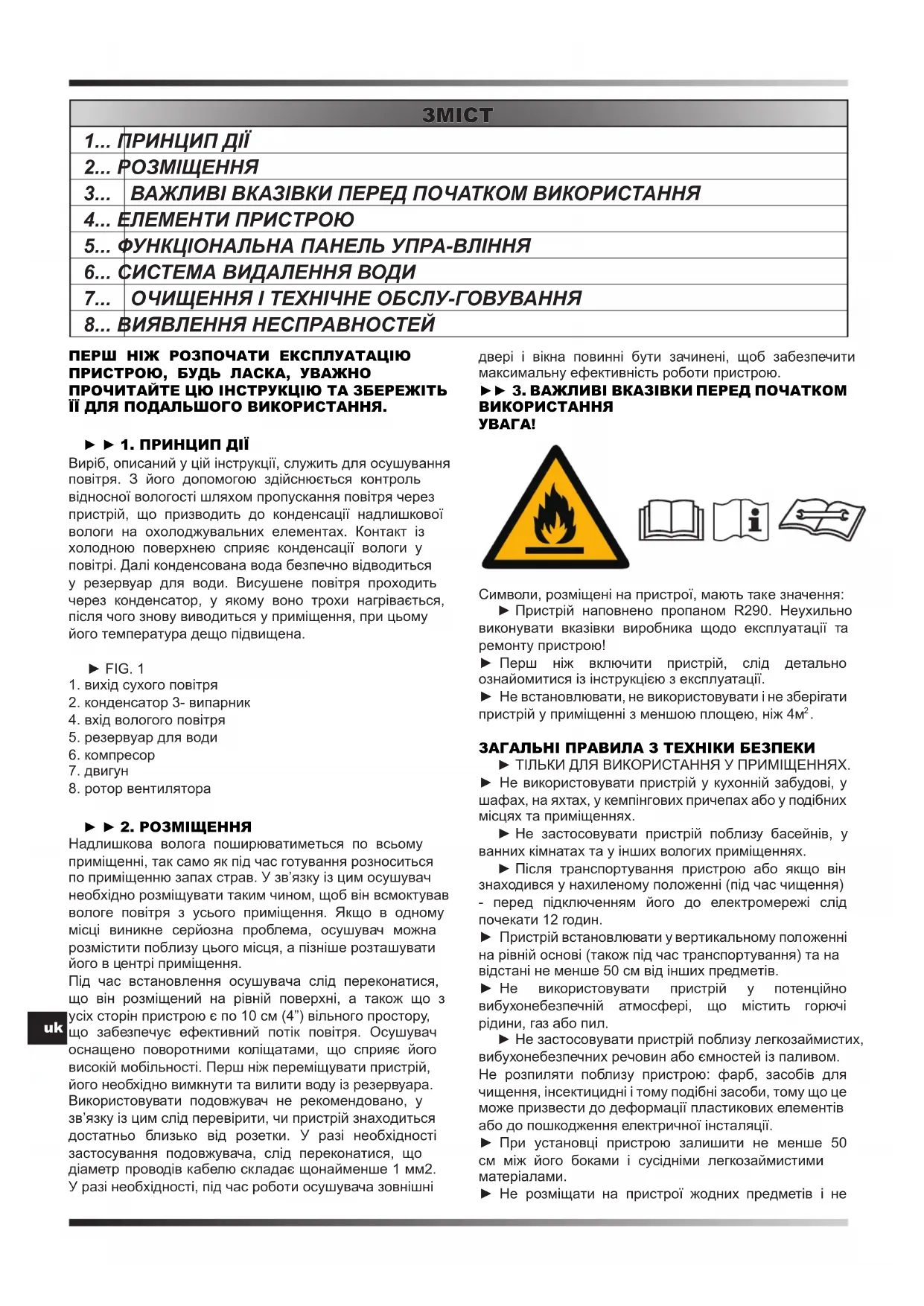 UAПЕРШ НІЖ РОЗПОЧАТИ ЕКСПЛУАТАЦІЮ ПРИСТРОЮ, БУДЬ ЛАСКА, УВАЖНО ПРОЧИТАЙТЕ ЦЮ ІНСТРУКЦІЮ ТА ЗБЕРЕЖІТЬ ЇЇ ДЛЯ ПОДАЛЬШОГО ВИКОРИСТАННЯ. ► ► 1. ПРИНЦИП ДІЇ Виріб, описаний у цій інструкції, служить для осушування повітря. З його допомогою здійснюється контроль відносної вологості шляхом пропускання повітря через пристрій, що призводить до конденсації надлишкової вологи на охолоджувальних елементах. Контакт із холодною поверхнею сприяє конденсації вологи у повітрі. Далі конденсована вода безпечно відводиться у резервуар для води. Висушене повітря проходить через конденсатор, у якому воно трохи нагрівається, після чого знову виводиться у приміщення, при цьому його температура дещо підвищена. ► FIG. 1