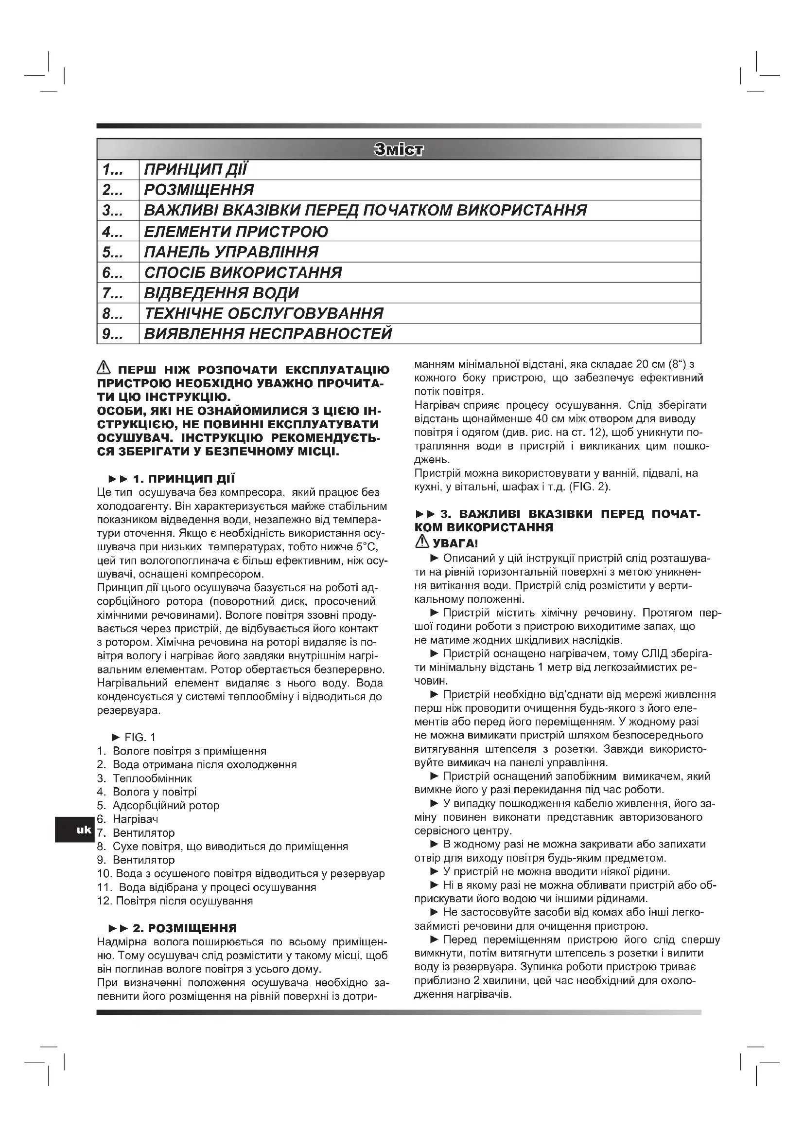 1... ПРИНЦИП ДІЇ 2... РОЗМІЩЕННЯ 3... ВАЖЛИВІ ВКАЗІВКИ ПЕРЕД ПОЧАТКОМ ВИКОРИСТАННЯ 4... ЕЛЕМЕНТИ ПРИСТРОЮ 5... ПАНЕЛЬ УПРАВЛІННЯ 6... СПОСІБ ВИКОРИСТАННЯ 7... ВІДВЕДЕННЯ ВОДИ 8... ТЕХНІЧНЕ ОБСЛУГОВУВАННЯ 9... ВИЯВЛЕННЯ НЕСПРАВНОСТЕЙ