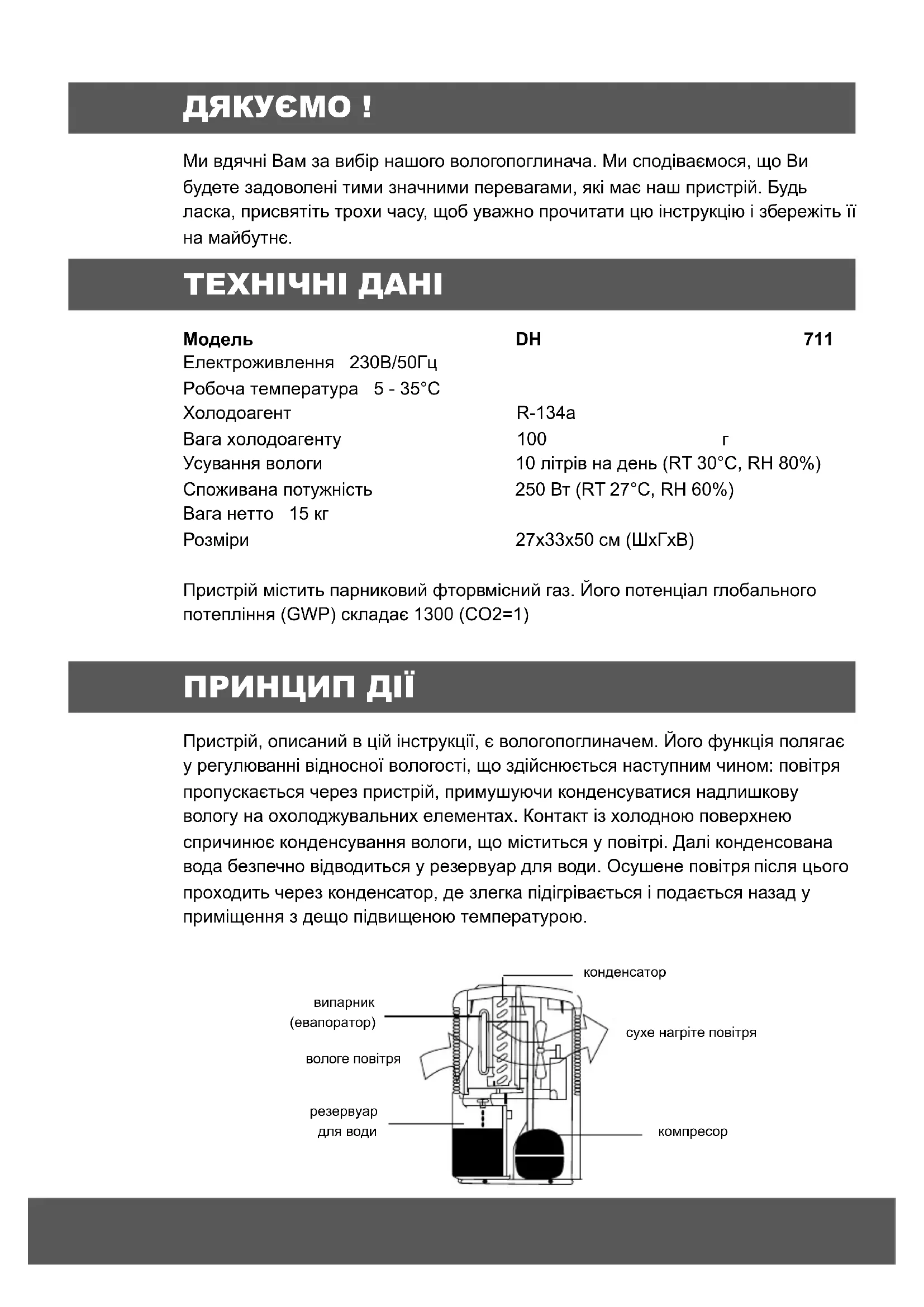 Ми вдячні Вам за вибір нашого вологопоглинача. Ми сподіваємося, що Ви будете задоволені тими значними перевагами, які має наш пристрій. Будь ласка, присвятіть трохи часу, щоб уважно прочитати цю інструкцію і збережіть її на майбутнє. ТЕХНІЧНІ ДАНІ Модель DH 711 Електроживлення 230В/50Гц Робоча температура 5 - 35°C Холодоагент R-134a Вага холодоагенту 100 г Усування вологи 10 літрів на день (RT 30°C, RH 80%) Споживана потужність 250 Вт (RT 27°C, RH 60%) Вага нетто 15 кг Розміри 27x33x50 см (ШxГxВ) Пристрій містить парниковий фторвмісний газ. Його потенціал глобального потепління (GWP) складає 1300 (CO2=1) ПРИНЦИП ДІЇ Пристрій, описаний в цій інструкції, є вологопоглиначем. Його функція полягає у регулюванні відносної вологості, що здійснюється наступним чином: повітря пропускається через пристрій, примушуючи конденсуватися надлишкову вологу на охолоджувальних елементах. Контакт із холодною поверхнею спричинює конденсування вологи, що міститься у повітрі. Далі конденсована вода безпечно відводиться у резервуар для води. Осушене повітря після цього проходить через конденсатор, де злегка підігрівається і подається назад у приміщення з дещо підвищеною температурою.ЗАСТОСУВАННЯ Вологопоглинач, описаний в цій інструкції, призначений для видалення вологи з повітря і створення здорового сприятливого мікроклімату. Його можна використовувати у ЖИЛИХ ПІДВАЛЬНИХ ПРИМІЩЕННЯХ, ПІДВАЛАХ, СКЛАДСЬКИХ ПРИМІЩЕННЯХ, НАСТІННИХ ШАФАХ, ПОБУТОВИХ ПРИМІЩЕННЯХ, КУХНЯХ, БІБЛІОТЕКАХ, ГАЛЕРЕЯХ, ПІДЗЕМНИХ ОБ’ЄКТАХ, КОМП’ЮТЕРНИХ ЗАЛАХ, АРХІВАХ, САЛОНАХ, СПАЛЬНЯХ … УМОВИ БЕЗПЕЧНОЇ ЕКСПЛУАТАЦІЇ
