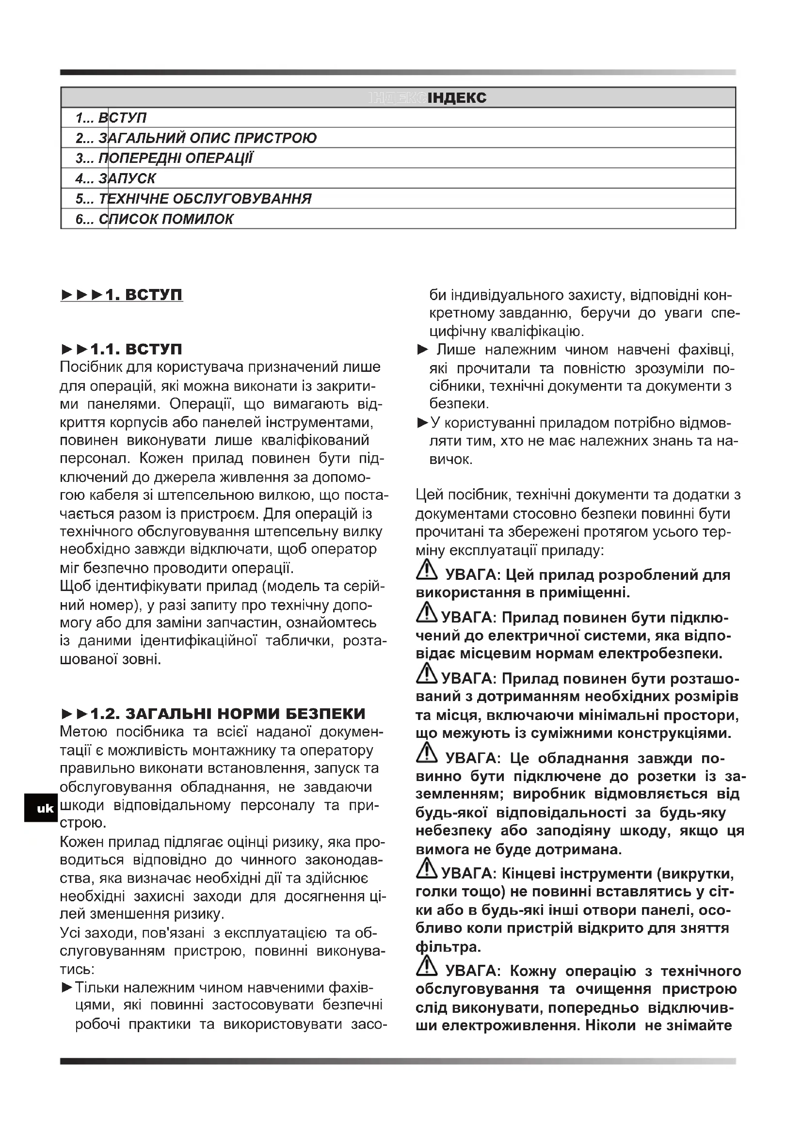 ІНДЕКСІНДЕКС 1... ВСТУП 2... ЗАГАЛЬНИЙ ОПИС ПРИСТРОЮ 3... ПОПЕРЕДНІ ОПЕРАЦІЇ 4... ЗАПУСК 5... ТЕХНІЧНЕ ОБСЛУГОВУВАННЯ 6... СПИСОК ПОМИЛОК ►►►1. ВСТУП ►►1.1. ВСТУП Посібник для користувача призначений лише для операцій, які можна виконати із закрити- ми панелями. Операції, що вимагають від- криття корпусів або панелей інструментами, повинен виконувати лише кваліфікований персонал. Кожен прилад повинен бути під- ключений до джерела живлення за допомо- гою кабеля зі штепсельною вилкою, що поста- чається разом із пристроєм. Для операцій із технічного обслуговування штепсельну вилку необхідно завжди відключати, щоб оператор міг безпечно проводити операції. Щоб ідентифікувати прилад (модель та серій- ний номер), у разі запиту про технічну допо- могу або для заміни запчастин, ознайомтесь із даними ідентифікаційної таблички, розта- шованої зовні. ►►1.2. ЗАГАЛЬНІ НОРМИ БЕЗПЕКИ Метою посібника та всієї наданої докумен- тації є можливість монтажнику та оператору правильно виконати встановлення, запуск та обслуговування обладнання, не завдаючи шкоди відповідальному персоналу та при-
