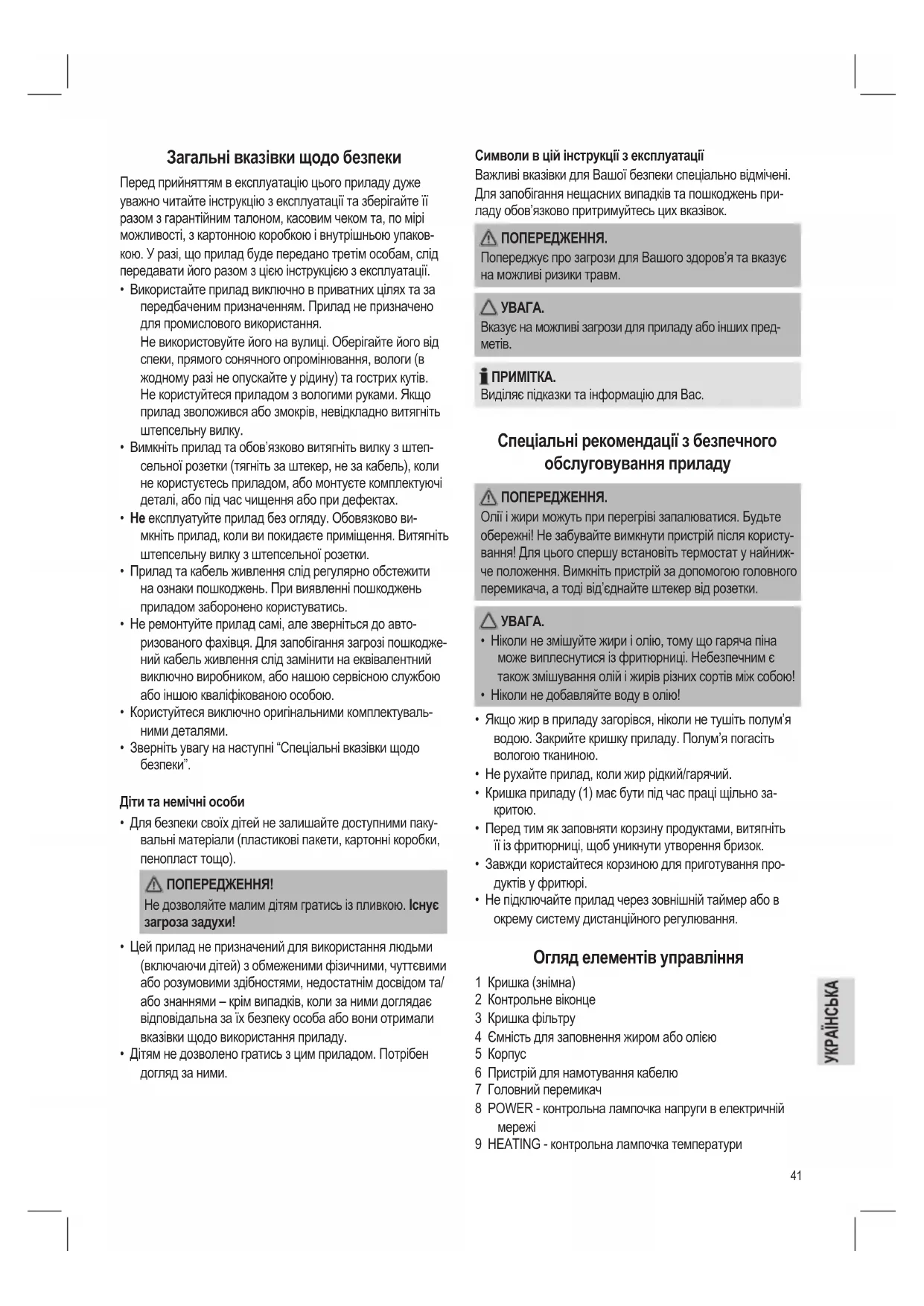 жиру (наприклад, шматочки картоплі - фрі). Після декількох разів приготування продуктів слід замінити олію або жир на свіжі. Застосовуйте для приготування продуктів тільки висо- коякісні олії та жири.