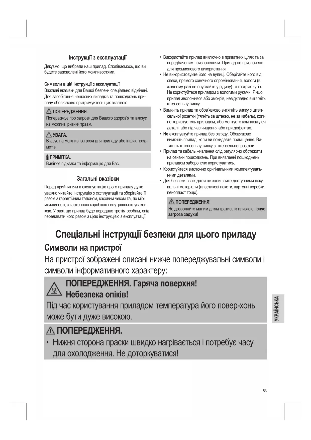 Виділяє підказки та інформацію для Вас. Загальні вказівки Перед прийняттям в експлуатацію цього приладу дуже уважно читайте інструкцію з експлуатації та зберігайте її разом з гарантійним талоном, касовим чеком та, по мірі можливості, з картонною коробкою і внутрішньою упаков- кою. У разі, що прилад буде передано третім особам, слід передавати його разом з цією інструкцією з експлуатації. Спеціальні інструкції безпеки для цього приладу Символи на пристрої На пристрої зображені описані нижче попереджувальні символи і символи інформативного характеру: ПОПЕРЕДЖЕННЯ. Гаряча поверхня! Небезпека опіків! Під час користування приладом температура його повер-хонь може бути дуже високою. ПОПЕРЕДЖЕННЯ.