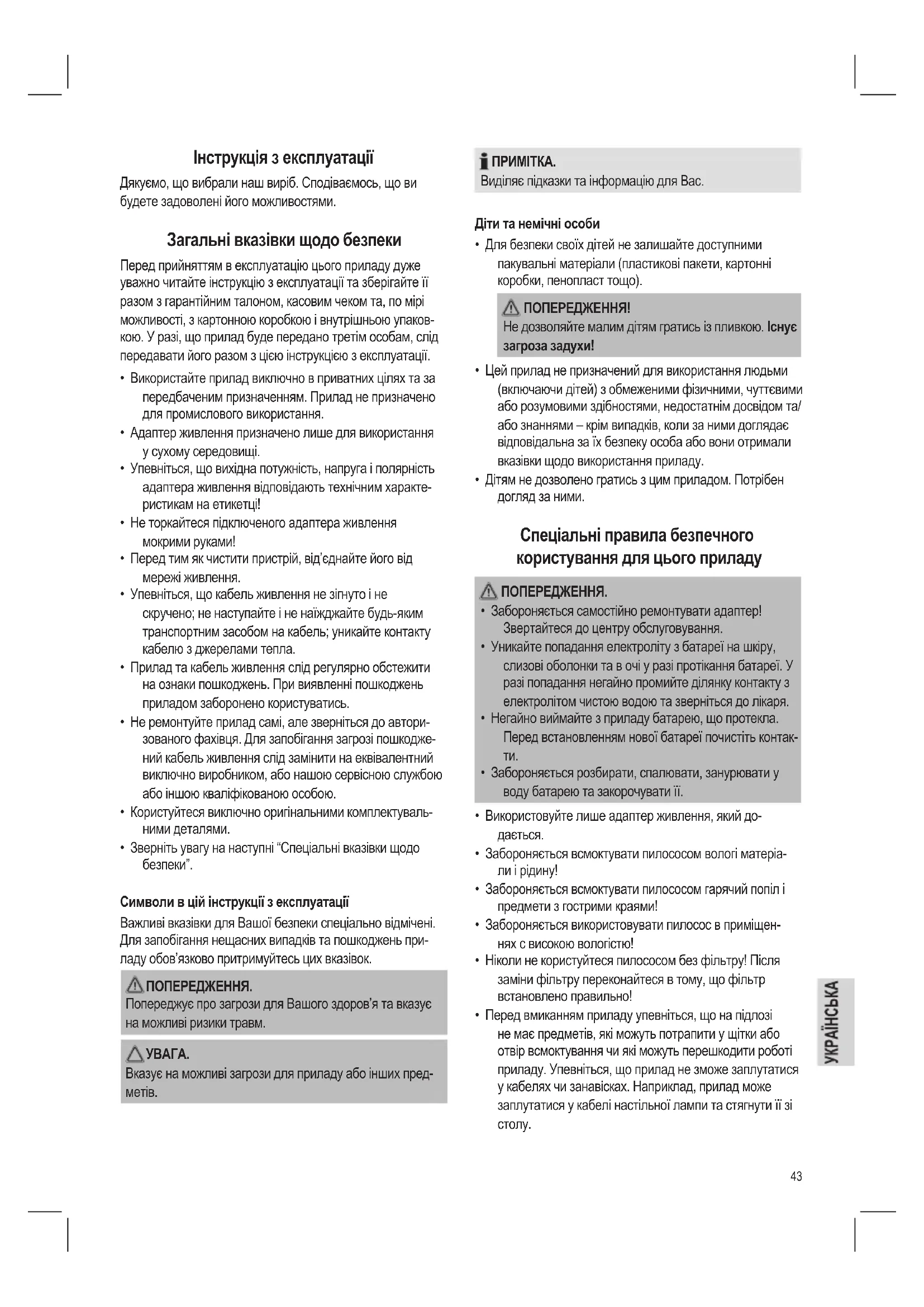 - Дітям не дозволено гратись з цим приладом. Потрібен догляд за ними. Спеціальні правила безпечного користування для цього приладу ПОПЕРЕДЖЕННЯ.