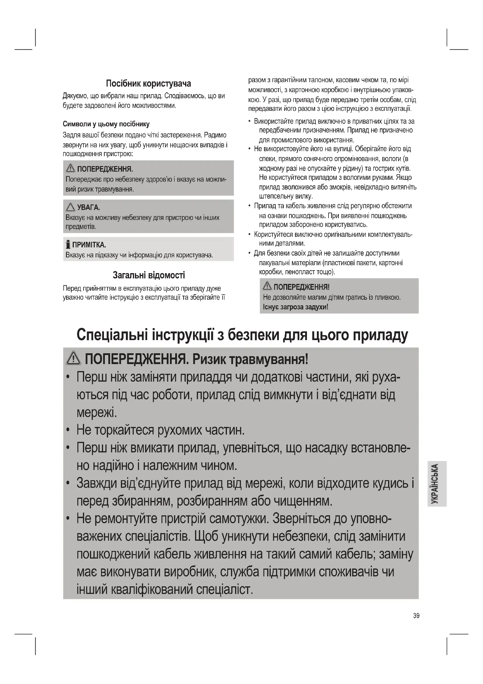- Для безпеки своїх дітей не залишайте доступними пакувальні матеріали (пластикові пакети, картонні коробки, пенопласт тощо). ПОПЕРЕДЖЕННЯ! Не дозволяйте малим дітям гратись із пливкою. Існує загроза задухи! Спеціальні інструкції з безпеки для цього приладу ПОПЕРЕДЖЕННЯ. Ризик травмування!