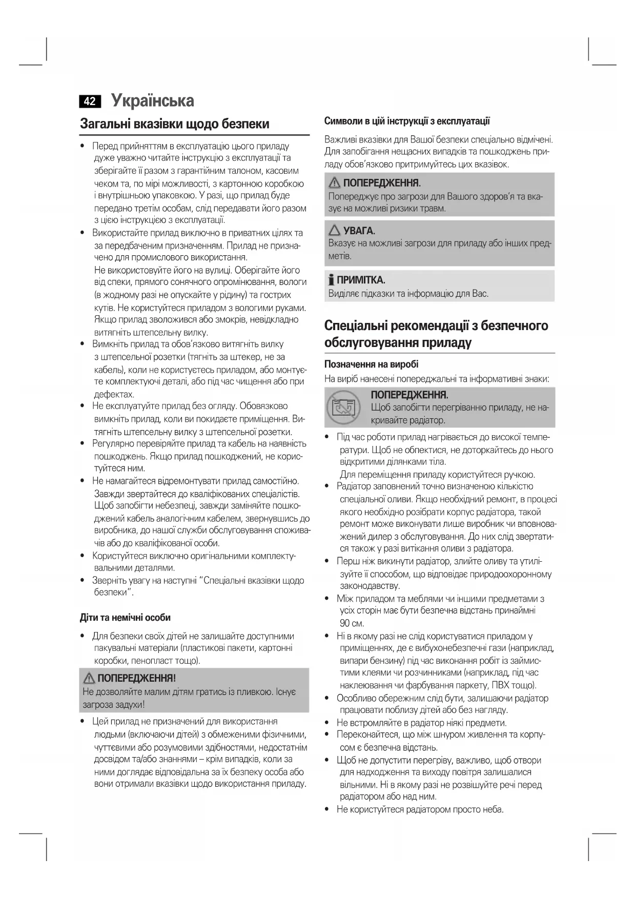 - Особливообережнимслідбути,залишаючирадіатор працюватипоблизудітейабобезнагляду.