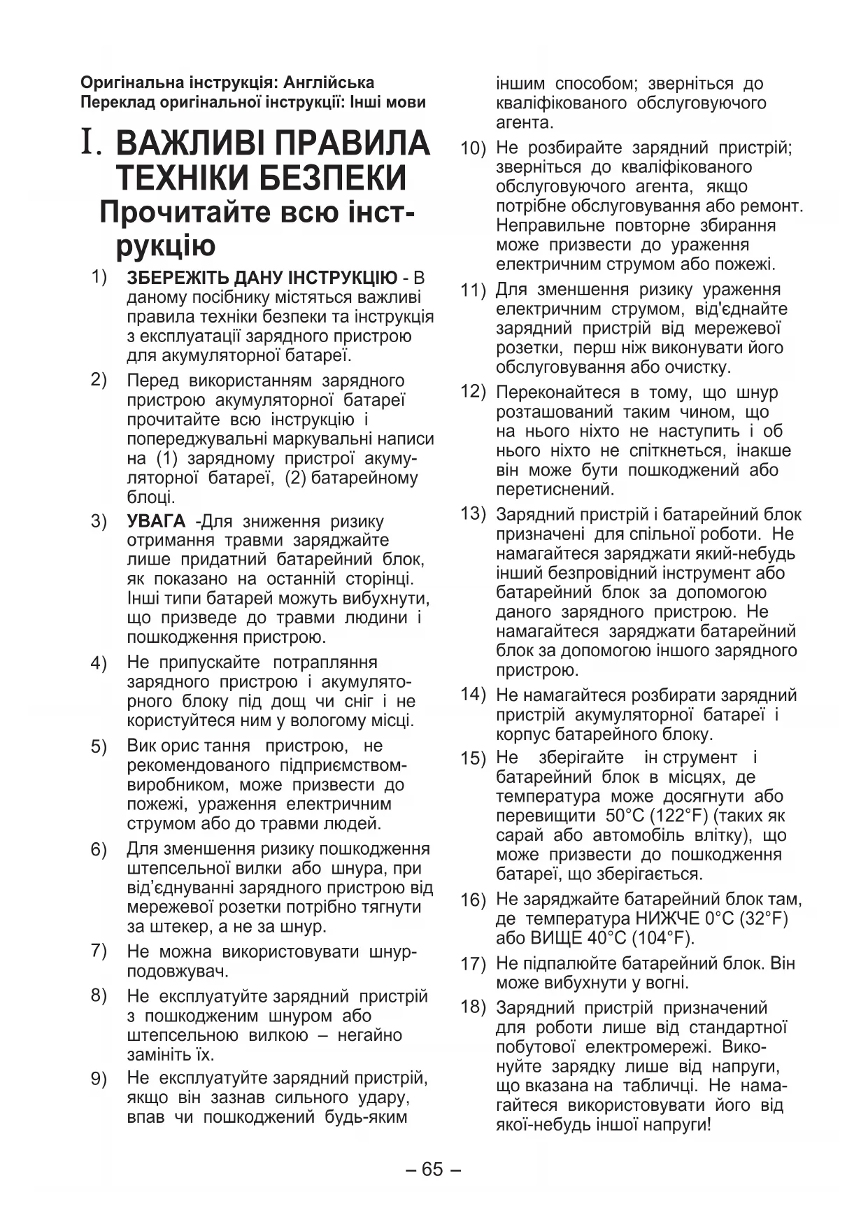 Перед використанням зарядного пристрою акумуляторної батареї прочитайте всю інструкцію і попереджувальні маркувальні написи на (1) зарядному пристрої акуму- ляторної батареї, (2) батарейному