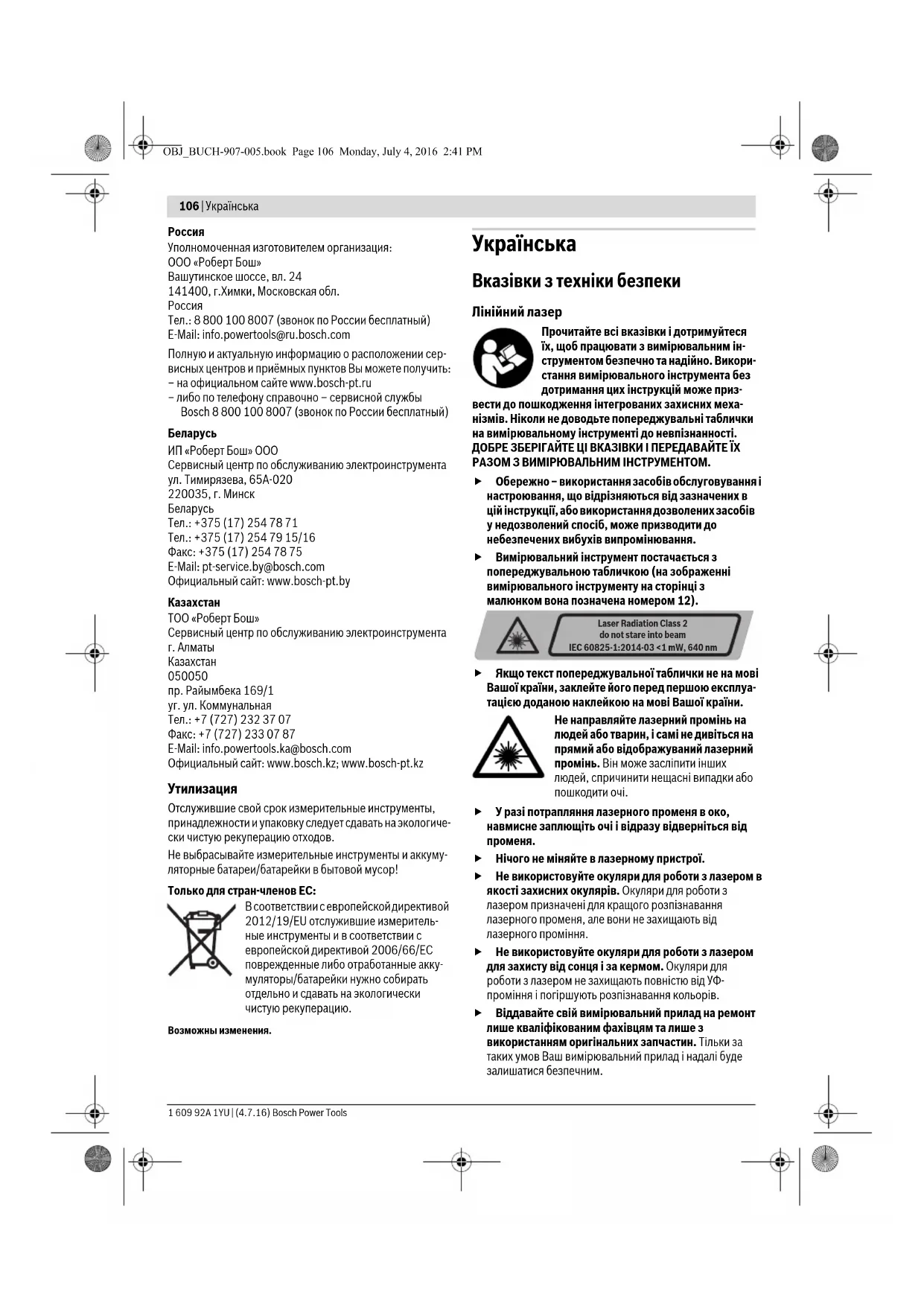 умов (напр., прямі сонячні промені). Для точної ідентифікації вимірювального приладу на заводській табличці позначений серійний номер 13. OBJ_BUCH-907-005.book Page 107 Monday, July 4, 2016 2:41 PM108 | Українська 1 609 92A 1YU | (4.7.16) Bosch Power Tools