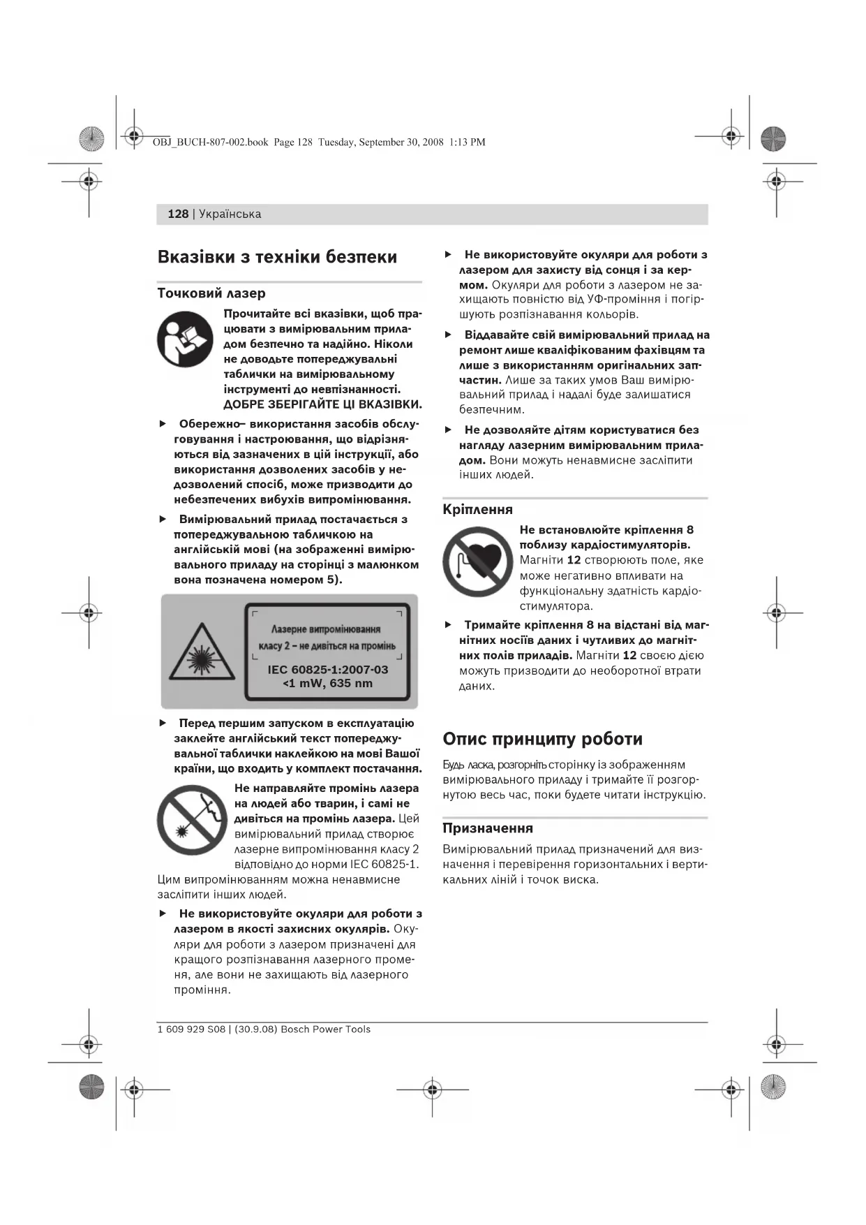 f Не використовуйте окуляри для роботи з лазером для захисту від сонця і за кер- мом. Окуляри для роботи з лазером не за- хищають повністю від УФ-проміння і погір- шують розпізнавання кольорів. f Віддавайте свій вимірювальний прилад на ремонт лише кваліфікованим фахівцям та лише з використанням оригінальних зап- частин. Лише за таких умов Ваш вимірю- вальний прилад і надалі буде залишатися