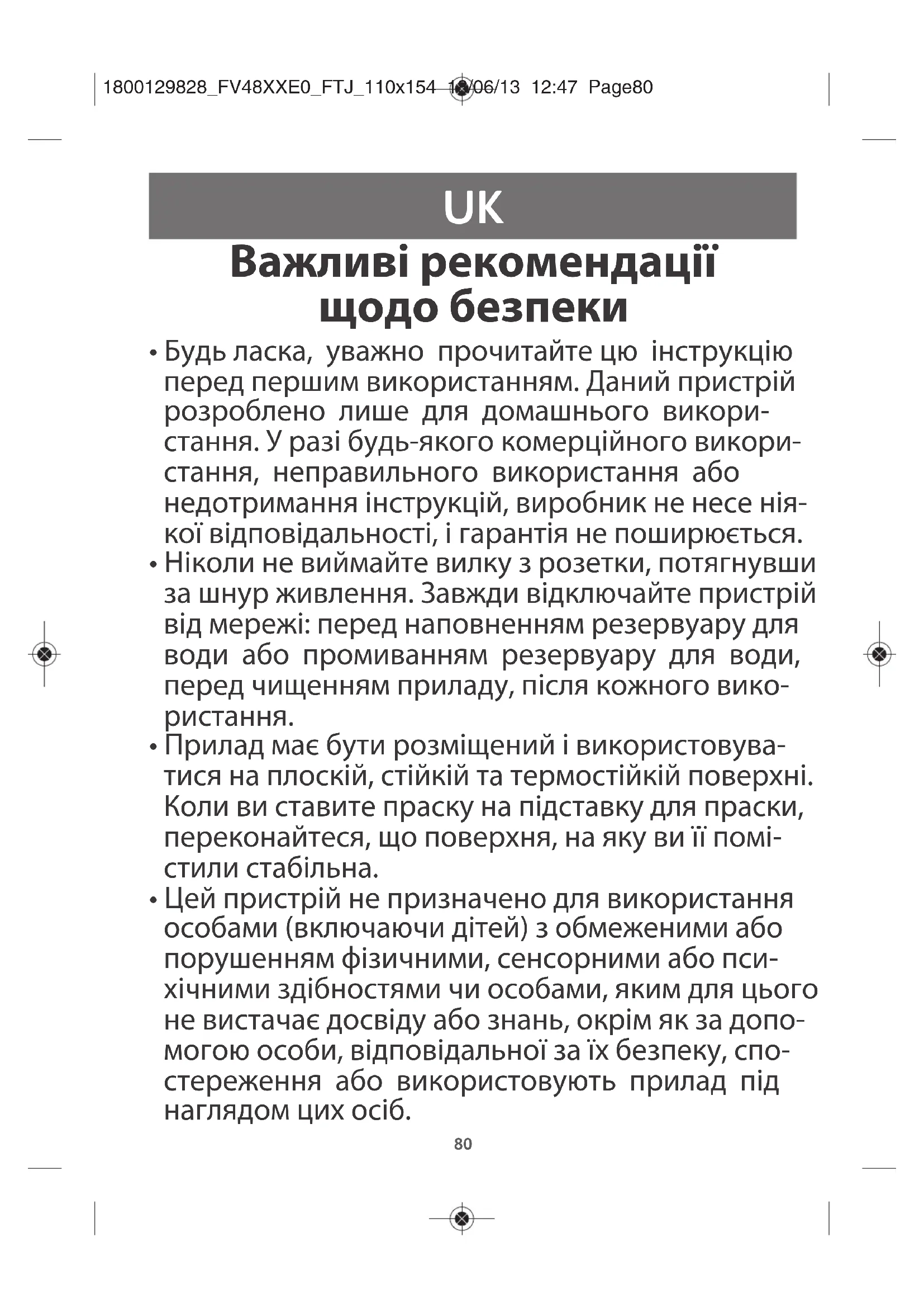 - Вилку необхідно витягнути з розетки перед заповненим водою резервуара для води. БУДЬ ЛАСКА, ЗБЕРІГАЙТЕ ЦЮ ІНСТРУКЦІЮ З ЕКСПЛУАТАЦІЇ ДЛЯ ВИКОРИСТАННЯ В МАЙБУТНЬОМУ 1800129828_FV48XXE0_FTJ_110x154 18/06/13 12:47 Page82EN