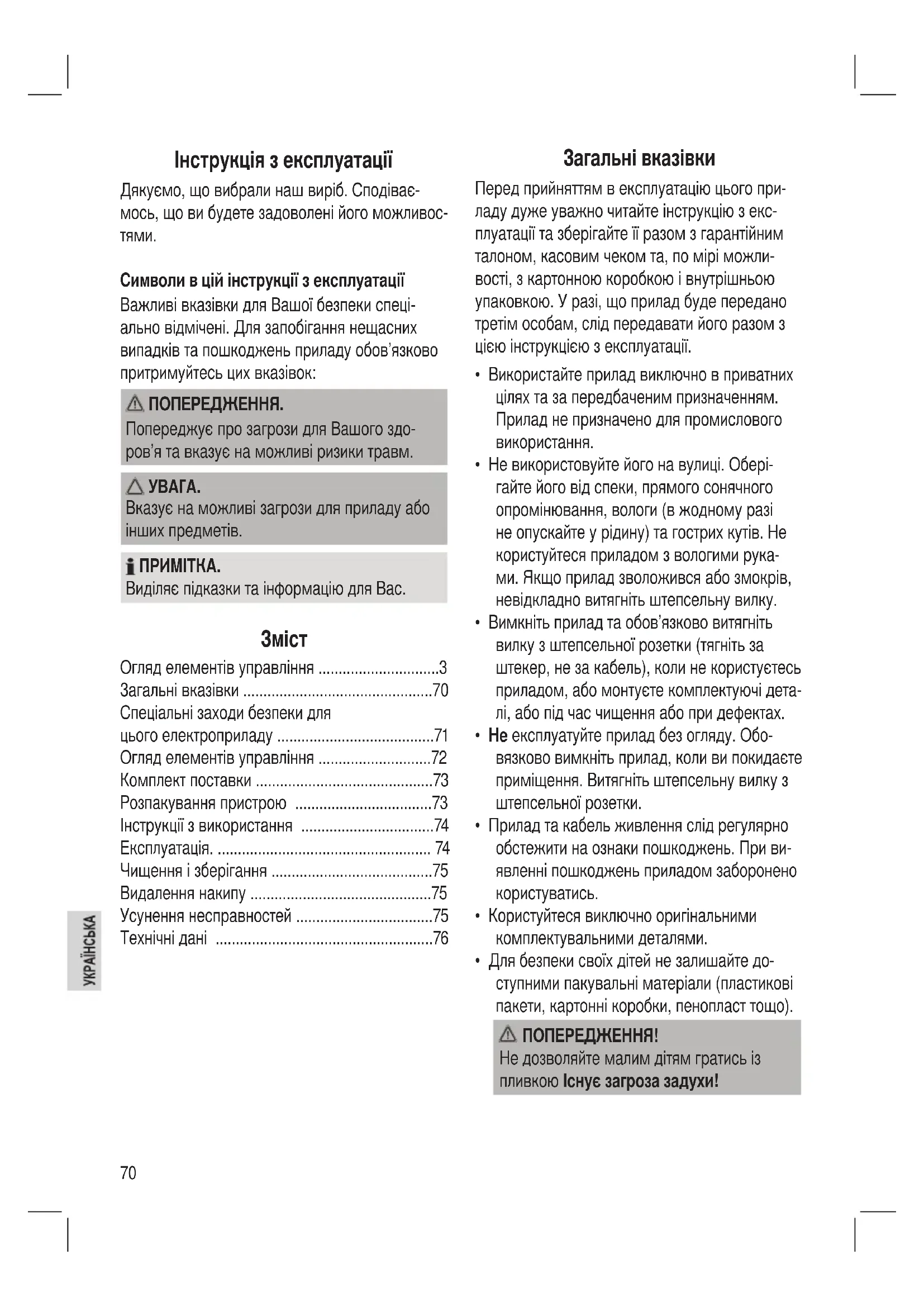 - Для безпеки своїх дітей не залишайте до- ступними пакувальні матеріали (пластикові пакети, картонні коробки, пенопласт тощо). ПОПЕРЕДЖЕННЯ! Не дозволяйте малим дітям гратись із пливкою Існує загроза задухи!71 Спеціальні заходи безпеки для цього електроприладу На пристро ї є описані нижче значки з попередженнями чи інфор-