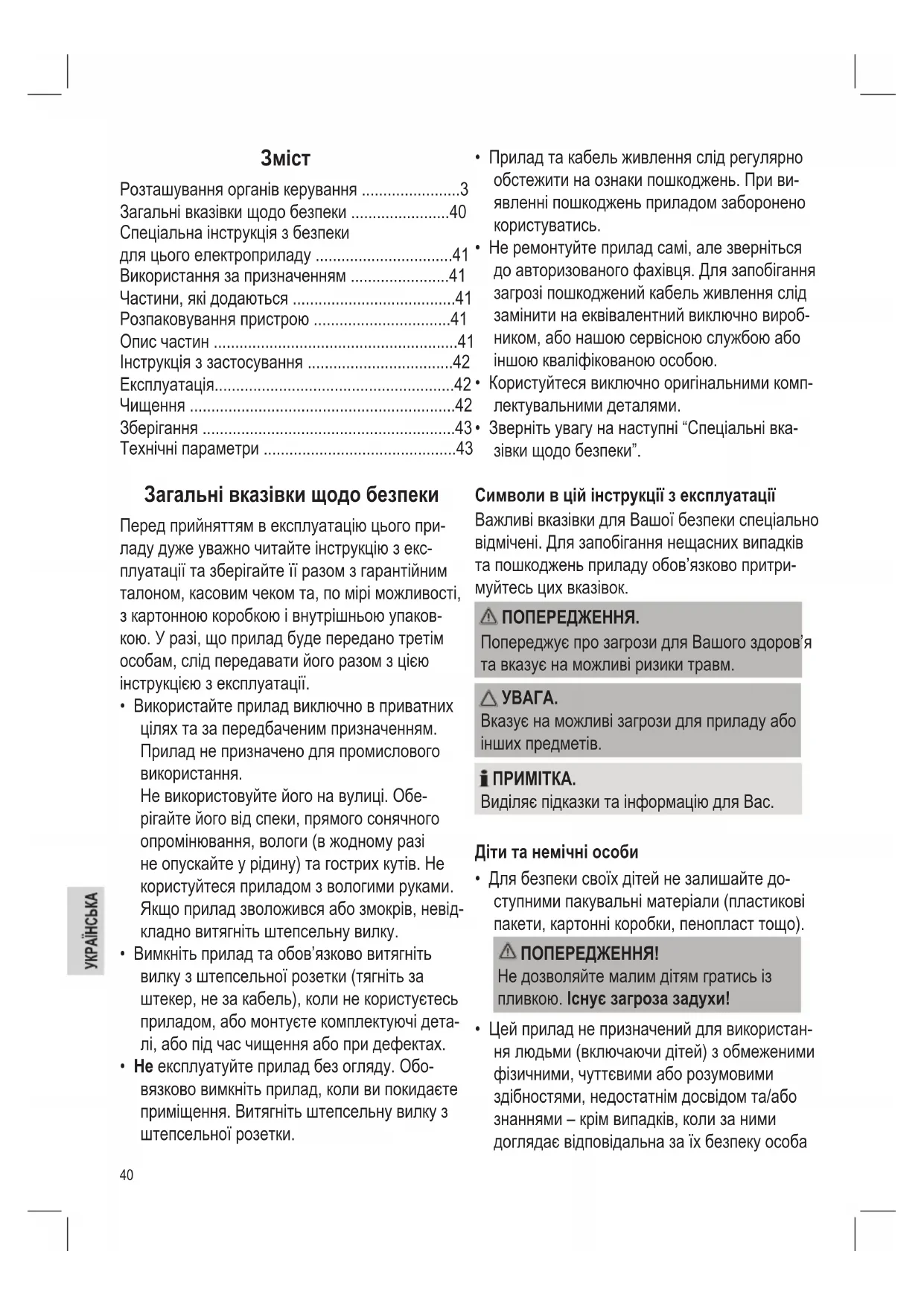 - Технічні параметри Загальні вказівки щодо безпеки Перед прийняттям в експлуатацію цього при- ладу дуже уважно читайте інструкцію з екс- плуатації та зберігайте її разом з гарантійним талоном, касовим чеком та, по мірі можливості, з картонною коробкою і внутрішньою упаков- кою. У разі, що прилад буде передано третім особам, слід передавати його разом з цією інструкцією з експлуатації. p. 43