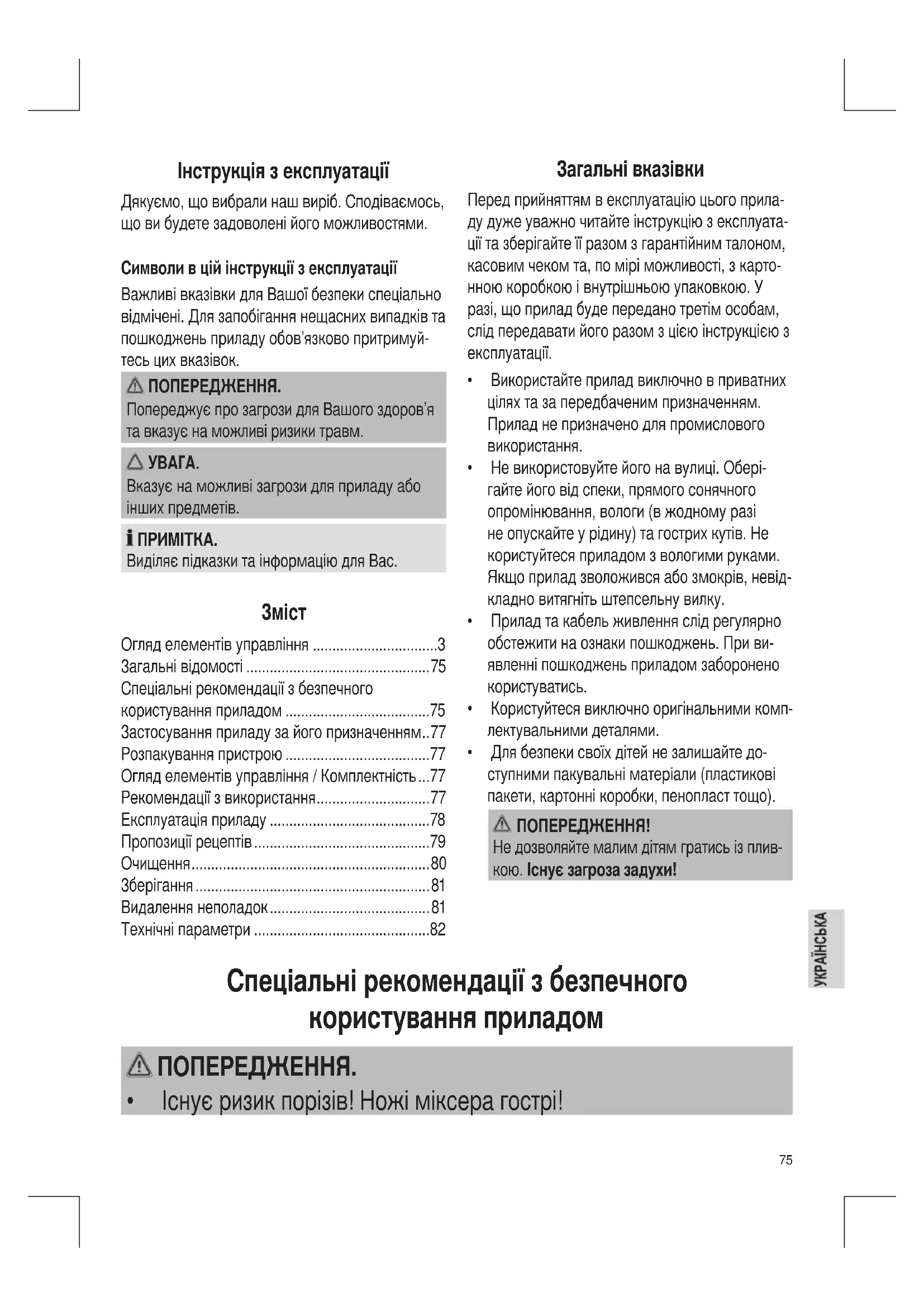 - Спеціальні рекомендації з безпечного користування приладом p. 75