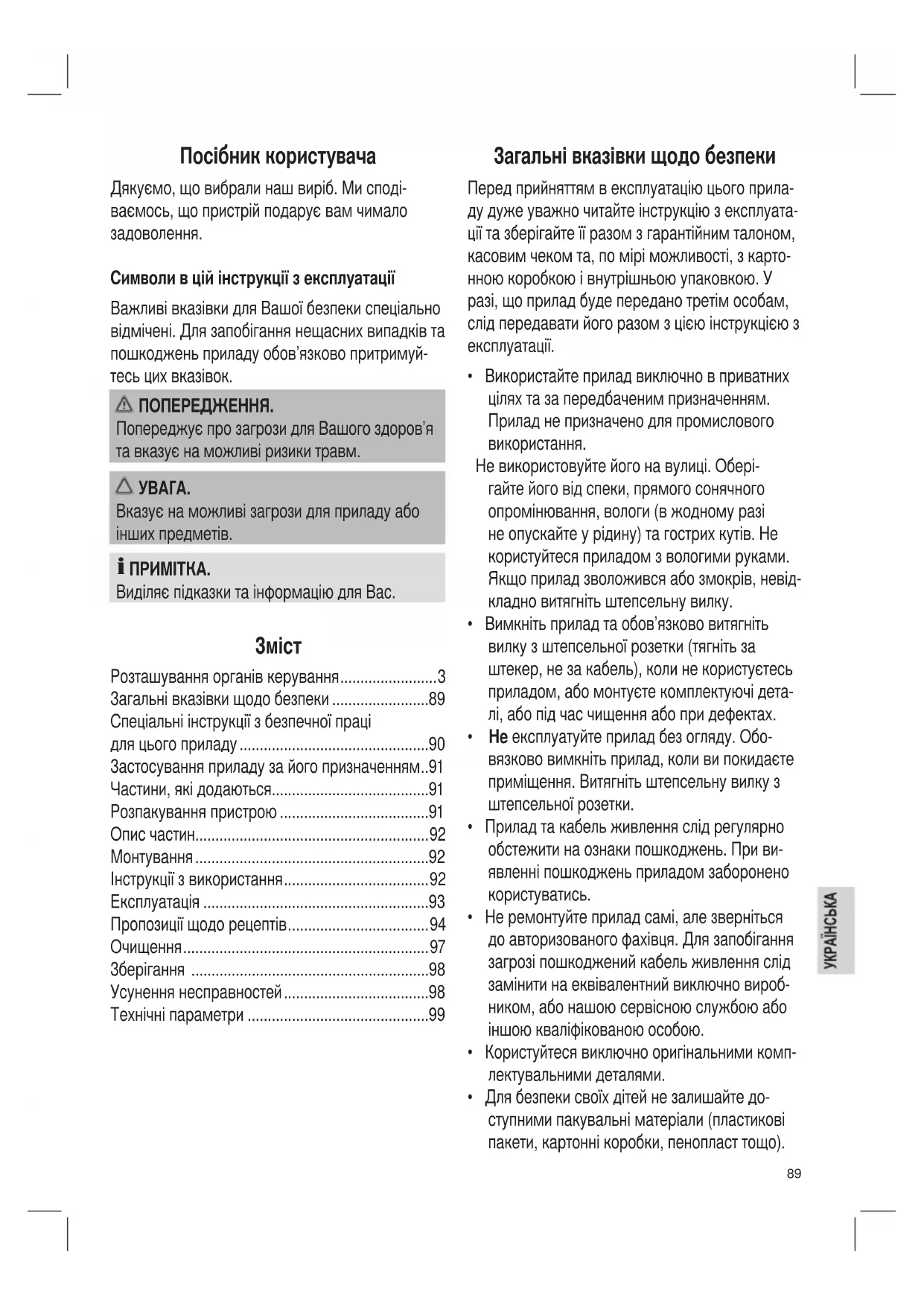 - Технічні параметри Загальні вказівки щодо безпеки Перед прийняттям в експлуатацію цього прила- ду дуже уважно читайте інструкцію з експлуата- ції та зберігайте її разом з гарантійним талоном, касовим чеком та, по мірі можливості, з карто- нною коробкою і внутрішньою упаковкою. У разі, що прилад буде передано третім особам, слід передавати його разом з цією інструкцією з експлуатації. p. 99