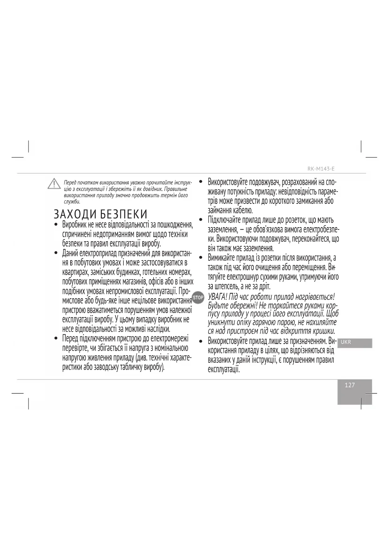 Пакувальний матеріал (плівка, пінопласт тощо) може бути небезпечним для дітей. Небезпека задушення! Зберігайте його в недоступному для дітей місці.129 UKR RK-M143-E