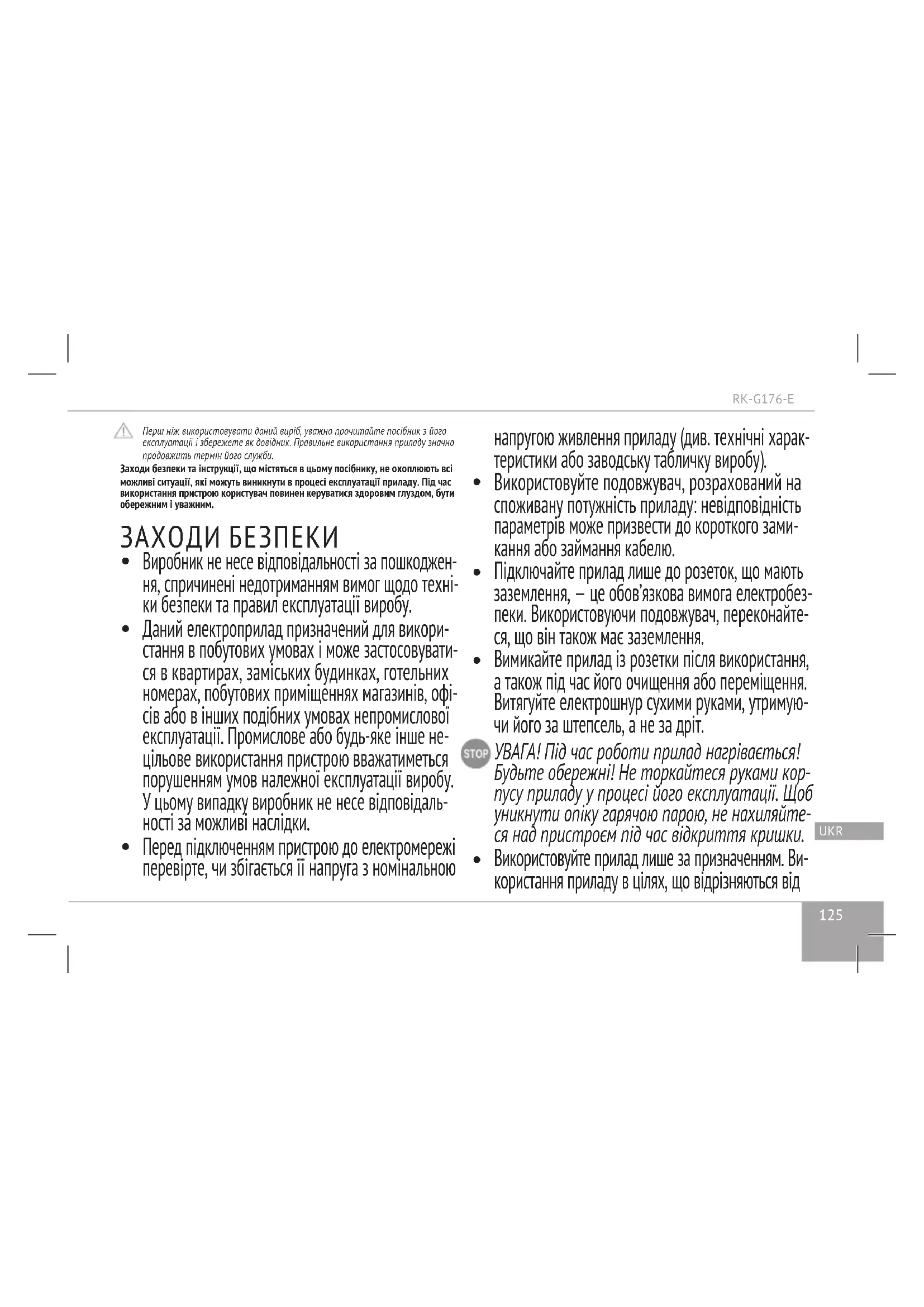 Даний прилад не призначений для використання людьми (в тому числі дітьми), в яких є фізичні, нервові або психічні відхилення або брак досвіду та знань, за винятком випадків, коли за такими особами здійснюється нагляд або проводиться їхній інструктаж щодо використання даного при- ладу особою, що відповідає за їхню безпеку. Не- обхідно наглядати за дітьми, щоб не допустити їхніх ігор із приладом, його комплектуючими, а також заводською упаковкою. Очищення й обслу- говування пристрою не мають виконувати діти без нагляду дорослих.RK-G176-E