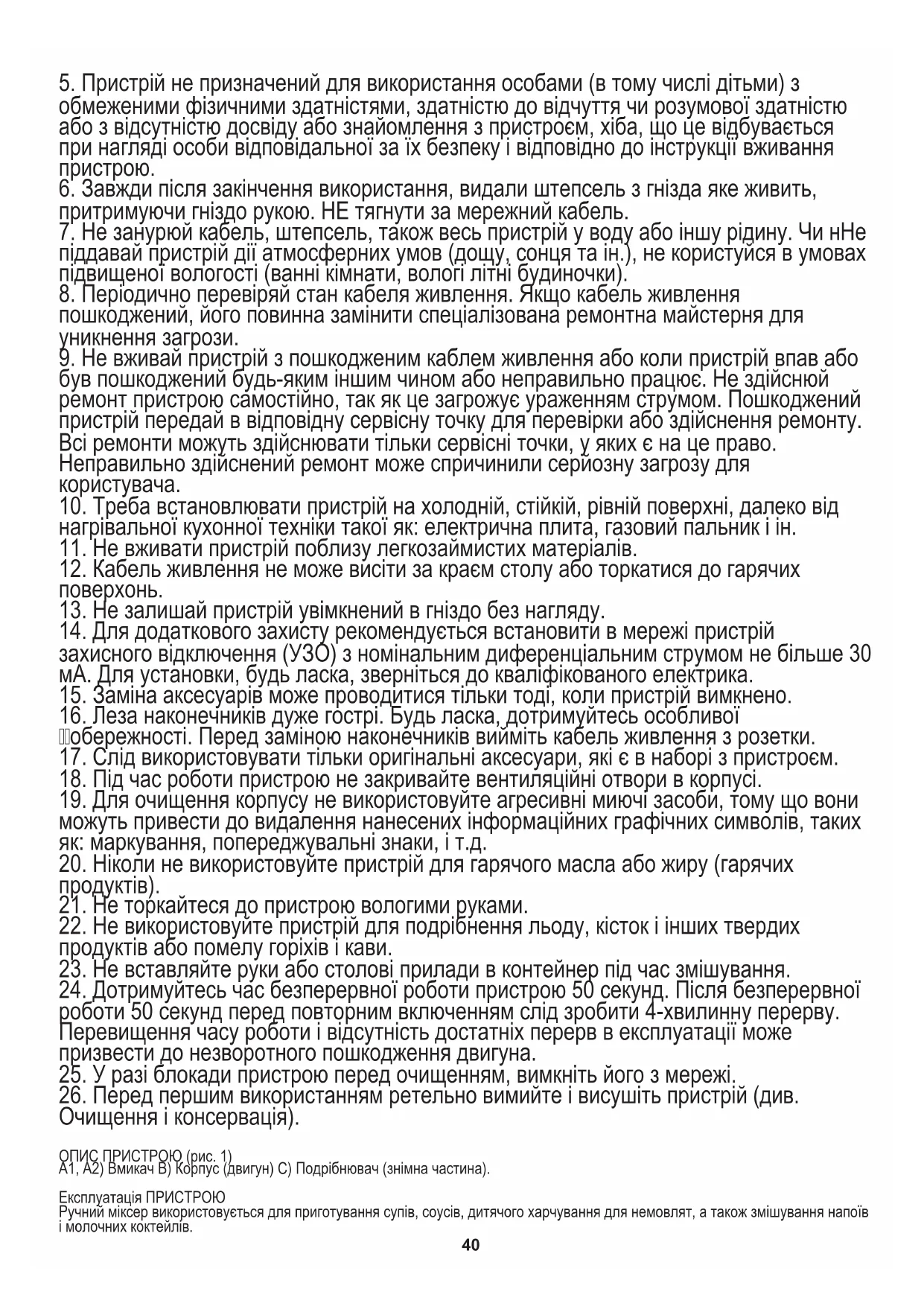 У інтересах навколишнього середовища. Будь ласка, віддайте картонну упаковку в місце збору мукулатури. Політиленові мішки (PE) викинути в смітник для пластику. Відпрацьований пристрій повинен бути відправлений у відповідну точку зберігання, тому що в пристрої є небезпечні інгредієнти, які можуть становити загрозу навколишньому середовищу. Електричний пристрій потрібно повернути так, щоб обмежити його повторне використання. Якщо у пристрої є батерейки, то потрібно їх витягнути і віддати до відповідного пунтку.25. V prípade blokovania zariadenia pred čistením ho vypnite zo siete. 2. Nástavec hlboko vložte do nádoby vyplnenej produktmi na zmixovanie a zapnite mixér, stlačením tlačidlá (obr. 1, A1 alebo A2).