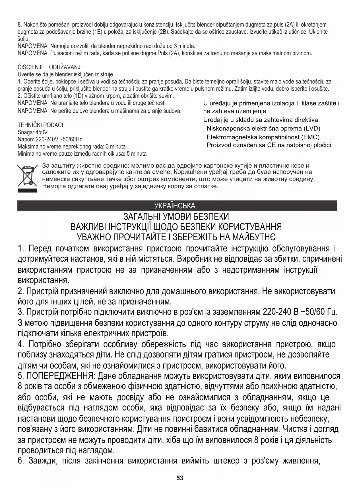 6. Après chaque utilisation, débrancher la fiche d'alimentation de la prise de courant, enlevant la prise avec la main. Ne pas tirer sur le cordon d'alimentation. 7. Ne pas tremper le cordon, la fiche ou l'appareil entier dans l'eau ou dans tout autre liquide. Ne pas exposer l'appareil à des conditions atmosphériques (pluie, soleil etc.). Ne pas l'utiliser non plus dans des conditions d'humidité élevée (salle de bain, mobile-homes humides). 8. Vérifier périodiquement l'état du cordon d'alimentation. Si le cordon d'alimentation est endommagé, il devra être changé par un service de réparation spécialisé afin d'éviter le danger. 9. Ne pas utiliser l'appareil si le cordon d'alimentation est endommagé, si l'appareil est tombé ou qu'il a été endommagé de quelque autre manière ou au cas où il ne fonctionne pas correctement. Ne pas réparer l'appareil soi-même car cela présente un risque d'électrocution. Un appareil endommagé doit être remis chez un professionnel pour vérification ou réparation. Toute réparation doit être effectuée par un service de réparation agréé. Une réparation mal effectuée peut constituer un danger non négligeable pour l'utilisateur. 10. L'appareil doit être posé sur une surface fraîche, stable et lisse, loin des appareils électroménagers dégageant de la chaleur (cuisinière électrique, brûleur à gaz etc.). 11. Ne pas utiliser l'appareil à proximité de matériaux inflammables. 12. Le cordon d'alimentation ne peut pas dépasser les bords de la table ou toucher des surfaces très chaudes. 13. Il est interdit de laisser l'appareil ou l'alimenteur branché à la prise de courant sans surveillance. 14. Afin d'assurer une protection supplémentaire, il est conseillé d'installer dans le réseau électrique un appareil à courant différentiel nominal ne dépassant pas 30mA. Pour cela il faut contacter un Electricien spécialisé. 15. Ne mettez pas les doigts ou autres objets dans le bol du blender, lorsque l'appareil est allumé. 16. Manipulez les lames prudemment pour éviter les blessures. 17. Faites attention à ne pas être accroché des cheveux longs, foulards, cravates, etc. au-dessus du bol, pendant le fonctionnement de l'appareil. 18. Des raisons de sécurité il faut utiliser des accessoires et des pièces de rechange appropriées pour votre modèle du blender et vendu par un service autorisé. 19. Au moment de démonter les accessoires il faut manipuler les lames très prudemment : ils peuvent blesser. 20. Ne lavez pas aucune partie du blender dans le lave-vaisselle. 21. Les changements des accessoires peuvent être effectués uniquement lorsque l'appareil est éteint. Débranchez l'appareil de la prise de courant. 22. N'insérez pas dans le bol du blender les produits autres que la nourriture et les liquides. Ne placez pas de plats chauds dans le bol. 23. L'appareil ne convient pas pour fouetter des protéines et pétrir la pâte. 24. Ne pas utiliser de détergents abrasifs pour laver, car ils peuvent aboutir à la suppression des symboles graphiques informatiques tracés, tels que : échelles, marques, signes d'alerte, etc. 25. Ne démarrez pas le bol mélangeant «sec» - sans le produit. 26. LE TEMPS MAXIMUM DE TRAVAIL DU BLENDER SANS INTERRUPTION EST 3