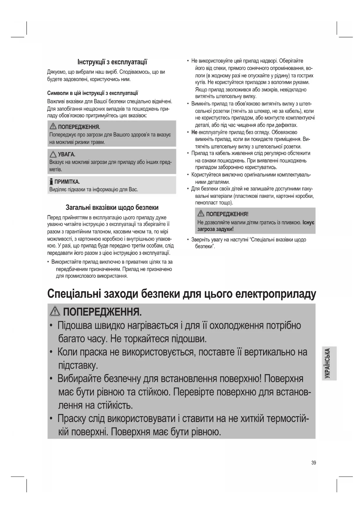 - Праску слід використовувати і ставити на не хиткій термостій- кій поверхні. Поверхня має бути рівною.40 ПОПЕРЕДЖЕННЯ.