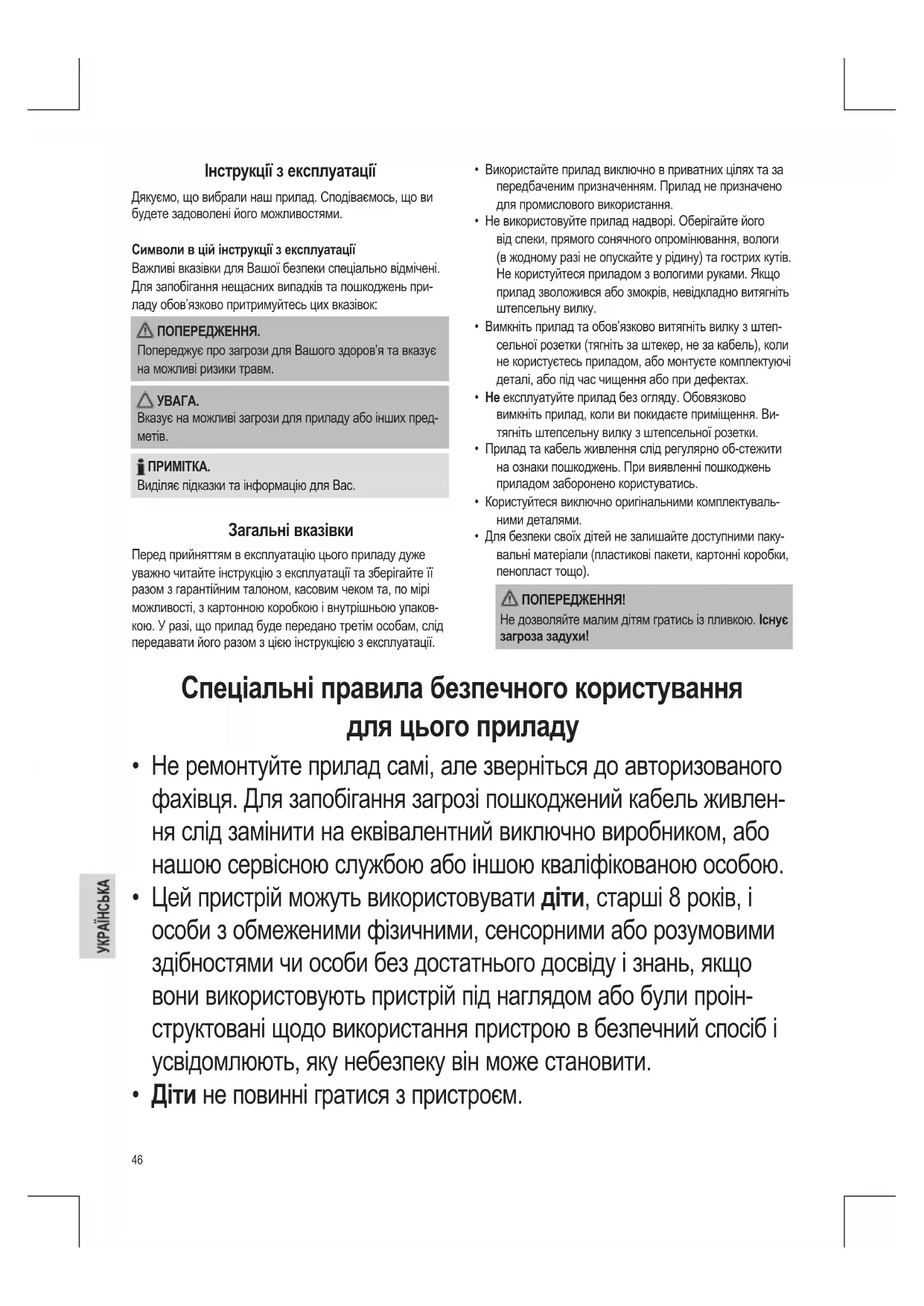 - Чищення і обслуговування пристрою не повинні виконуватись дітьми без нагляду дорослих.